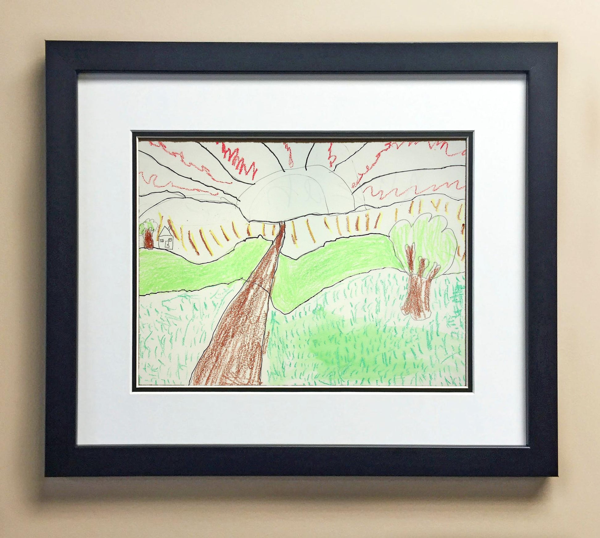 Included with the purchase is the Students Artwork, Frame, double matboard, shatter proof plexiglass, and a ready to hang backerboard with turnbuttons