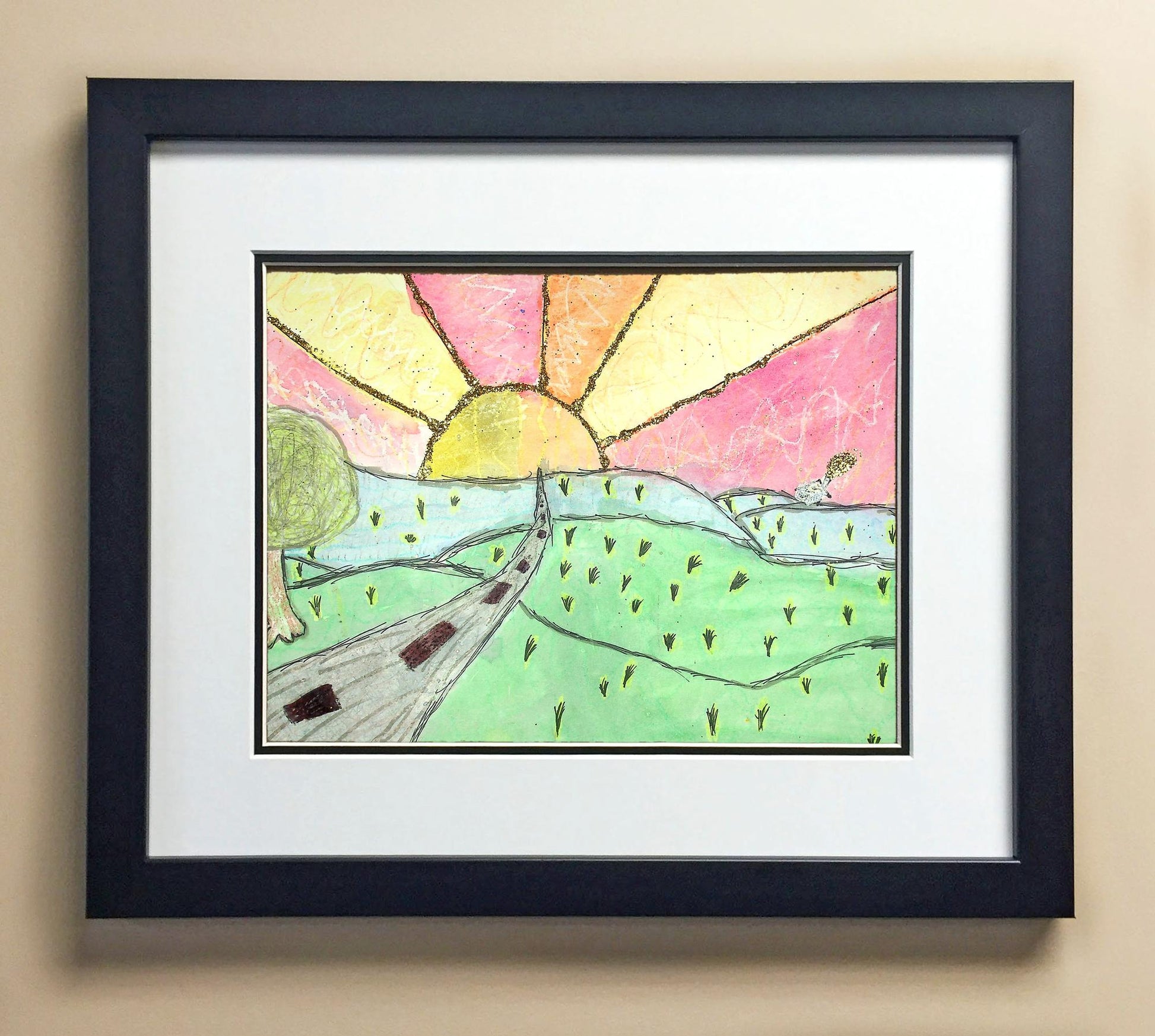 Included with the purchase is the Students Artwork, Frame, double matboard, shatter proof plexiglass, and a ready to hang backerboard with turnbuttons