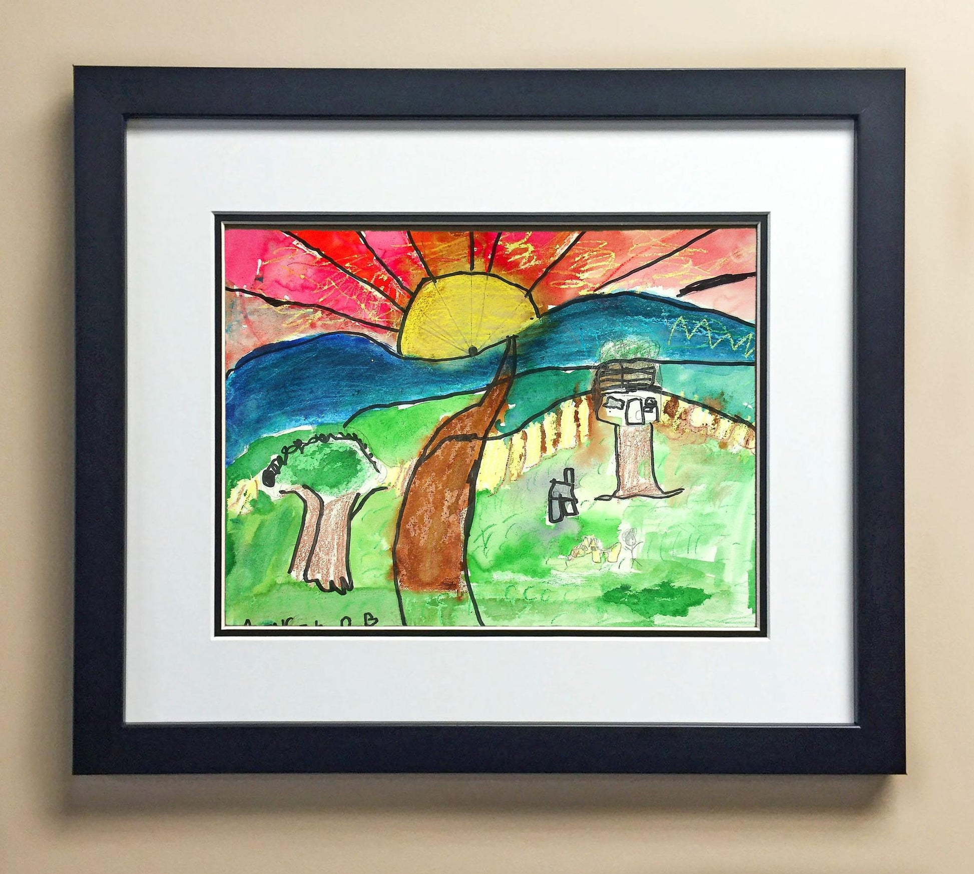 Included with the purchase is the Students Artwork, Frame, double matboard, shatter proof plexiglass, and a ready to hang backerboard with turnbuttons