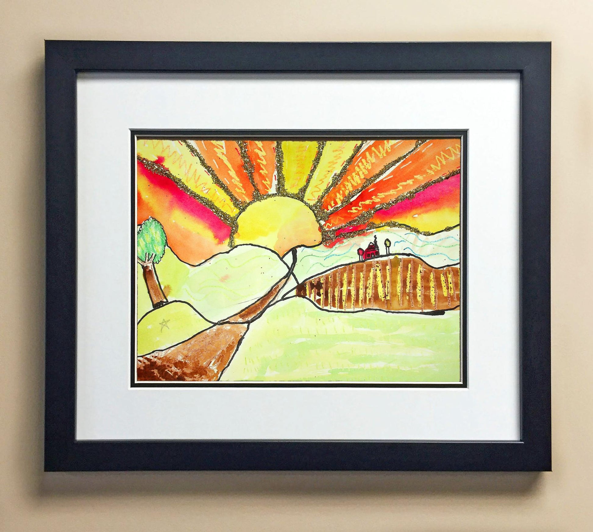 Included with the purchase is the Students Artwork, Frame, double matboard, shatter proof plexiglass, and a ready to hang backerboard with turnbuttons