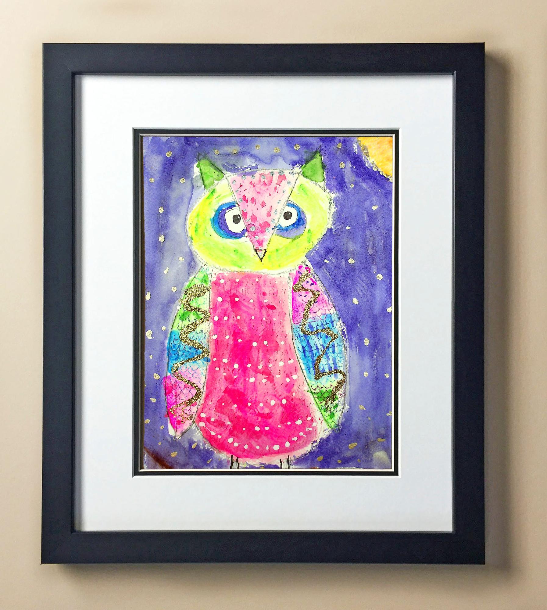 Included with the purchase is the Students Artwork, Frame, double matboard, shatter proof plexiglass, and a ready to hang backerboard with turnbuttons