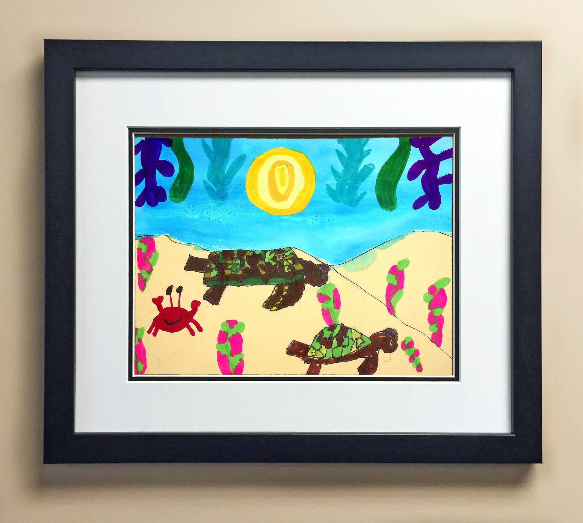 Included with the purchase is the Students Artwork, Frame, double matboard, shatter proof plexiglass, and a ready to hang backerboard with turnbuttons