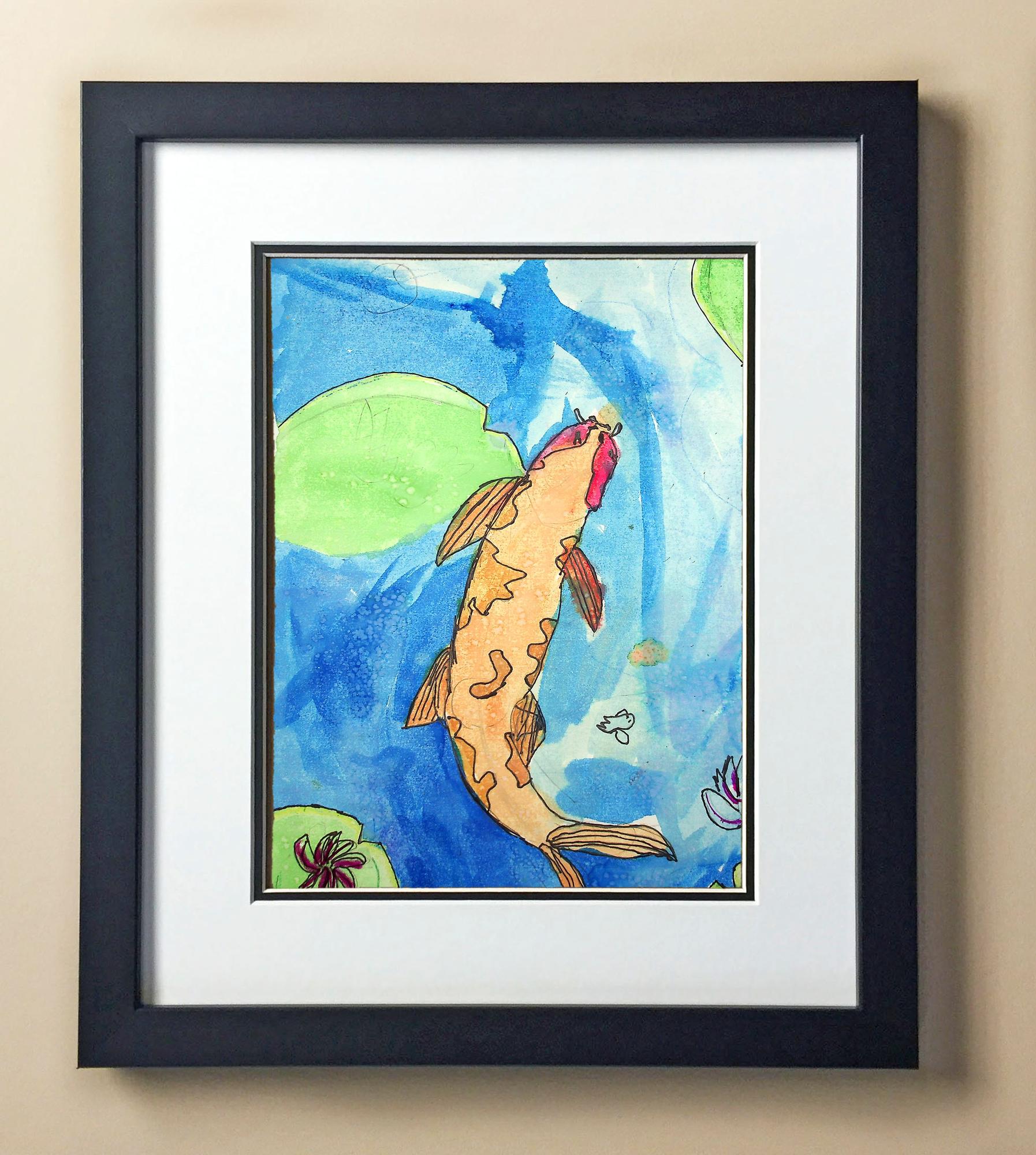 Included with the purchase is the Students Artwork, Frame, double matboard, shatter proof plexiglass, and a ready to hang backerboard with turnbuttons