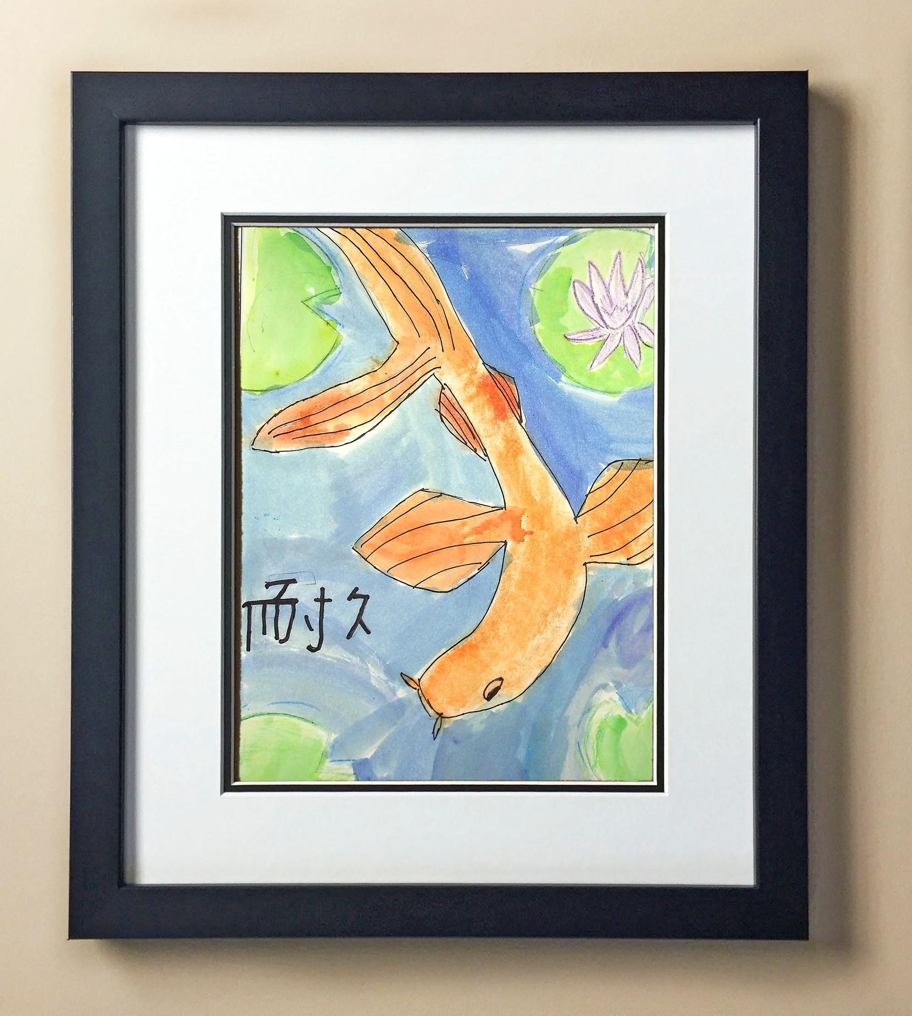 Included with the purchase is the Students Artwork, Frame, double matboard, shatter proof plexiglass, and a ready to hang backerboard with turnbuttons
