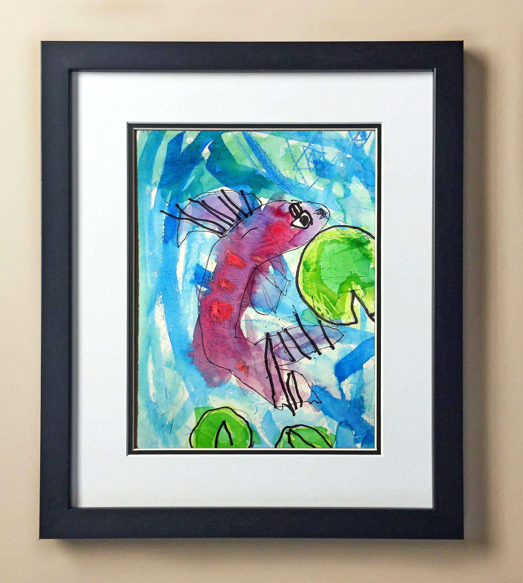 Included with the purchase is the Students Artwork, Frame, double matboard, shatter proof plexiglass, and a ready to hang backerboard with turnbuttons