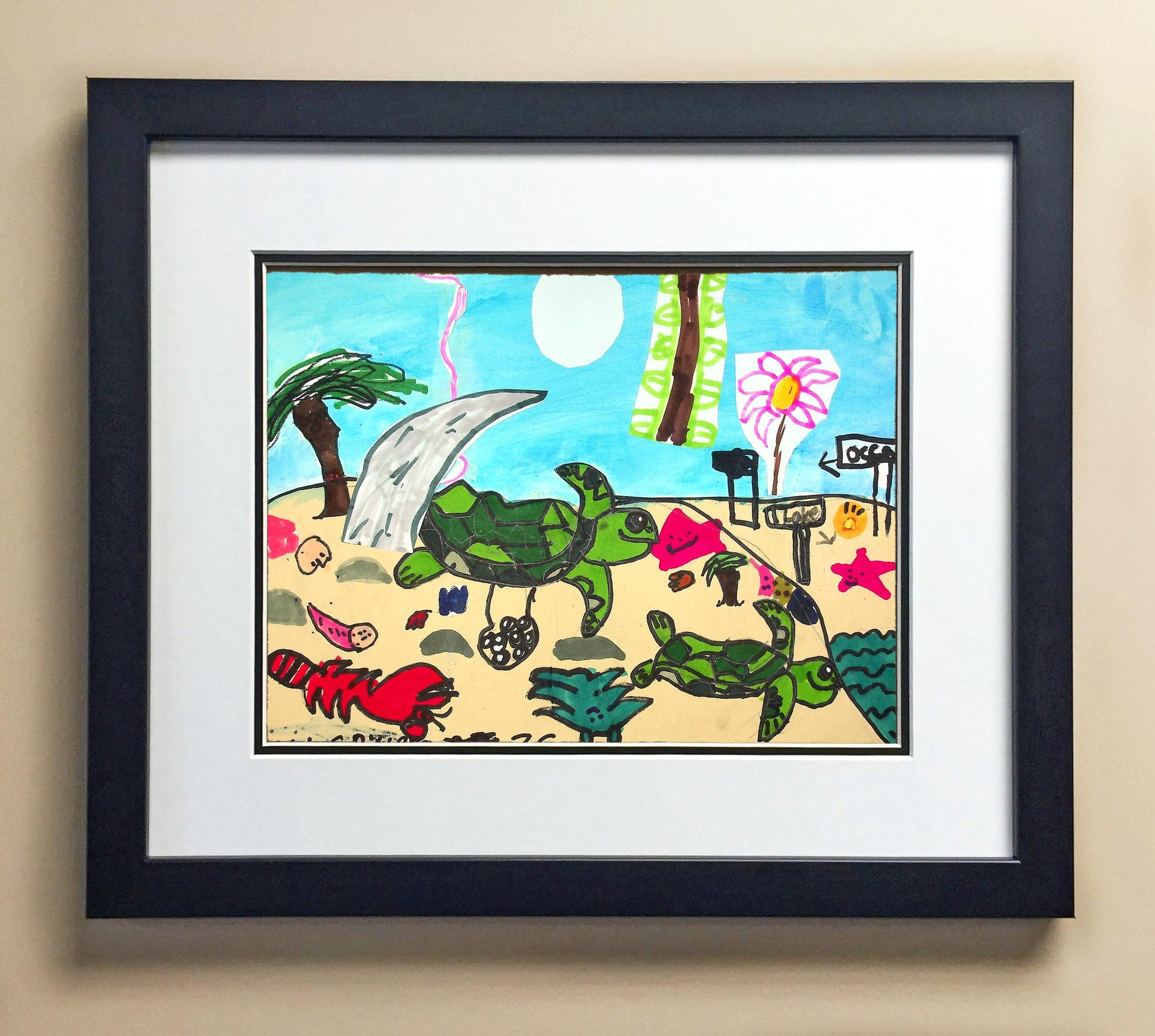 Included with the purchase is the Students Artwork, Frame, double matboard, shatter proof plexiglass, and a ready to hang backerboard with turnbuttons