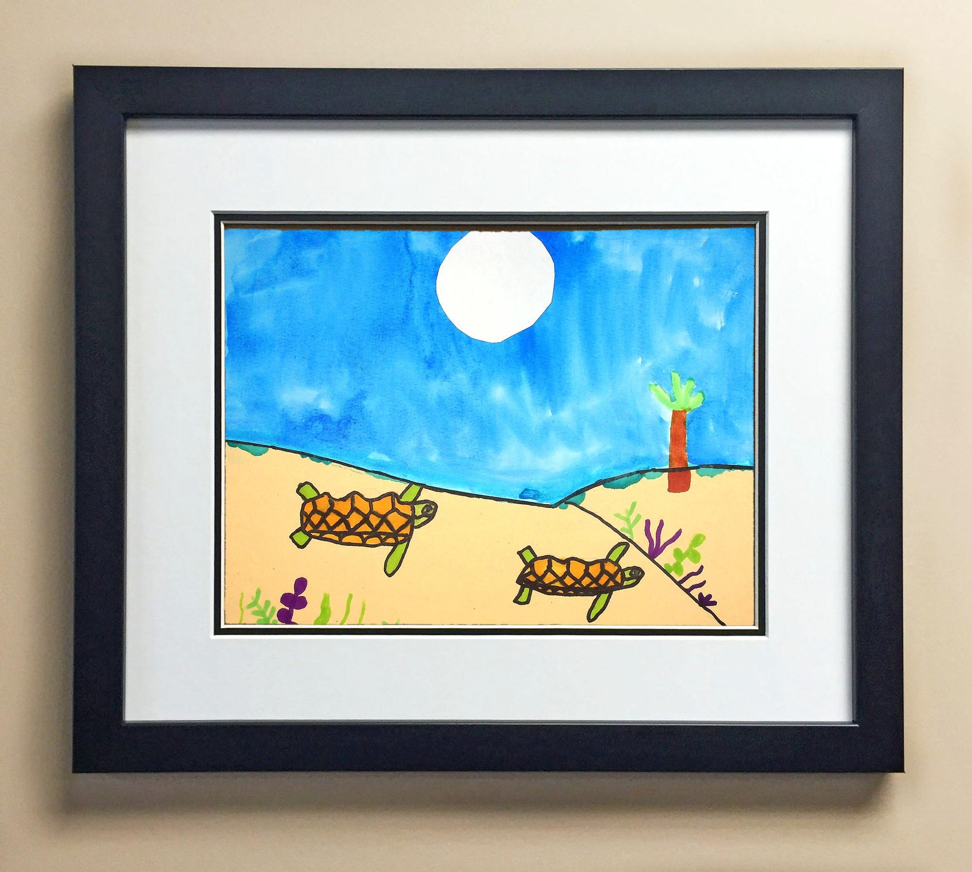 Included with the purchase is the Students Artwork, Frame, double matboard, shatter proof plexiglass, and a ready to hang backerboard with turnbuttons