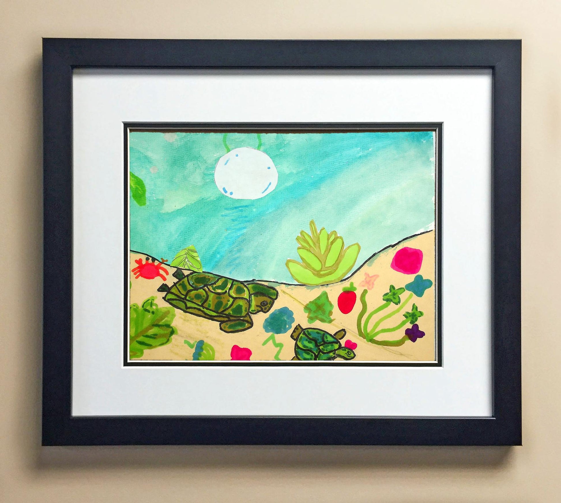 Included with the purchase is the Students Artwork, Frame, double matboard, shatter proof plexiglass, and a ready to hang backerboard with turnbuttons