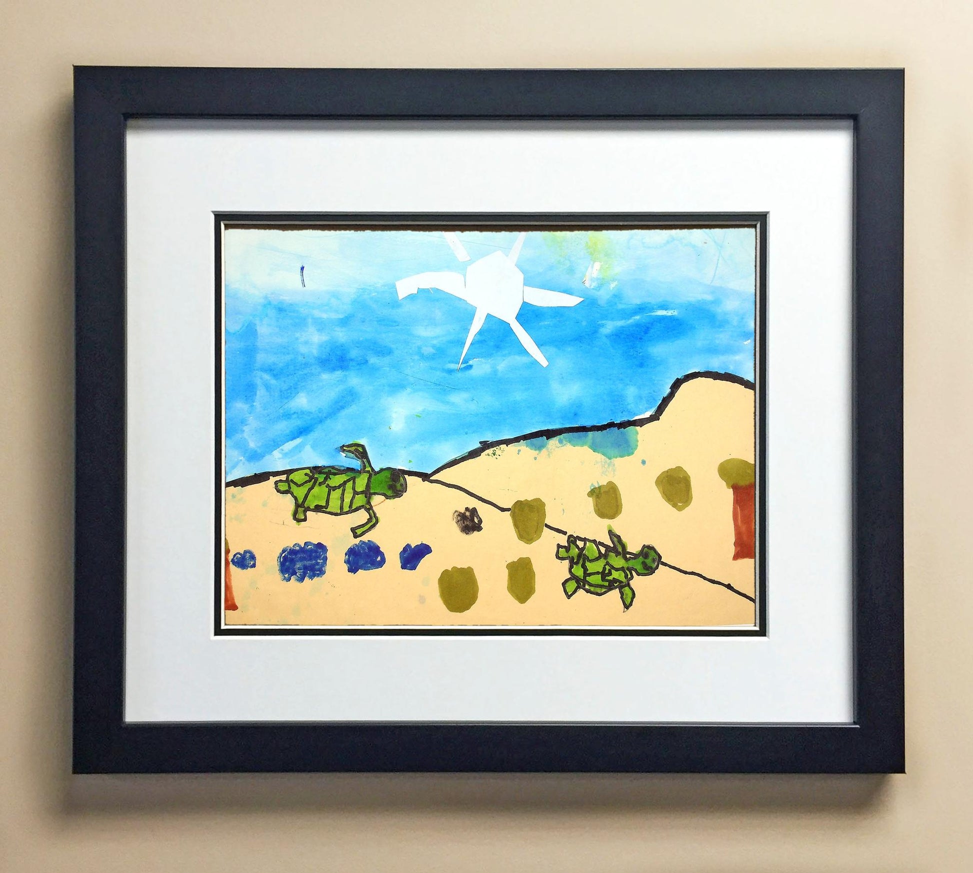 Included with the purchase is the Students Artwork, Frame, double matboard, shatter proof plexiglass, and a ready to hang backerboard with turnbuttons