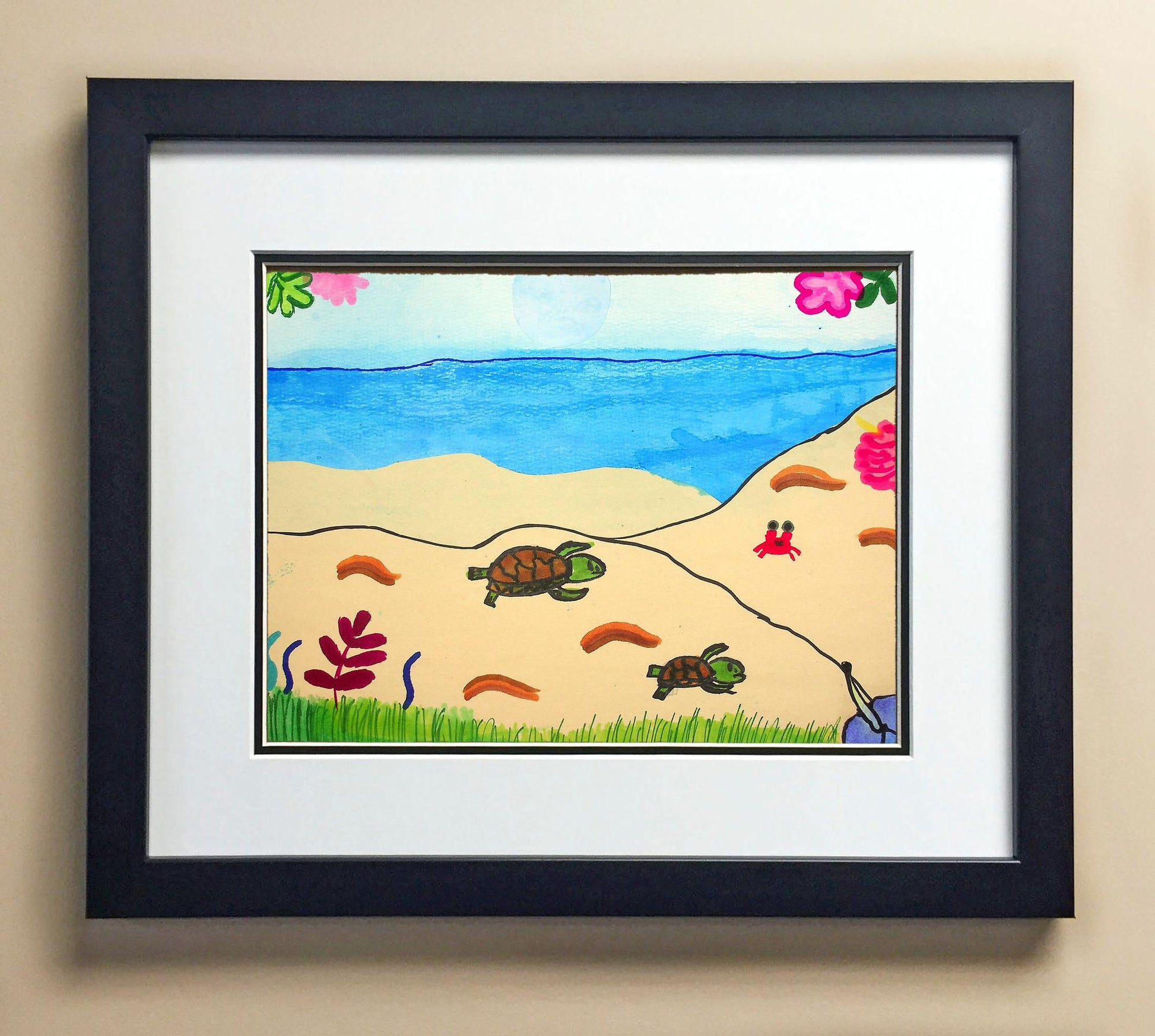 Included with the purchase is the Students Artwork, Frame, double matboard, shatter proof plexiglass, and a ready to hang backerboard with turnbuttons