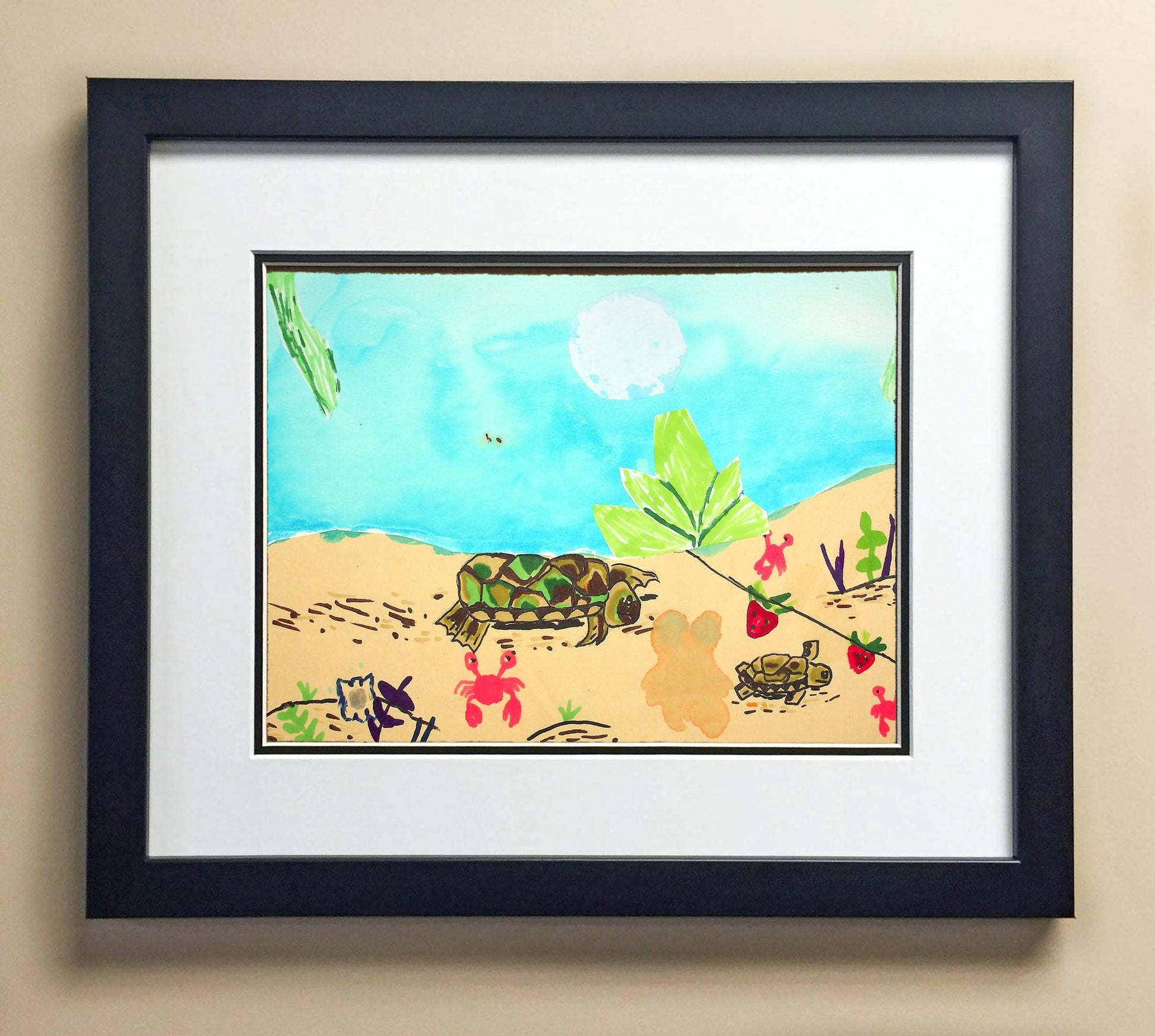 Included with the purchase is the Students Artwork, Frame, double matboard, shatter proof plexiglass, and a ready to hang backerboard with turnbuttons