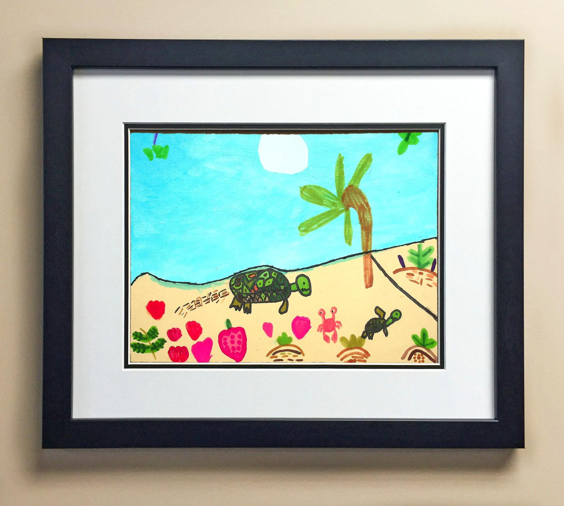 Included with the purchase is the Students Artwork, Frame, double matboard, shatter proof plexiglass, and a ready to hang backerboard with turnbuttons