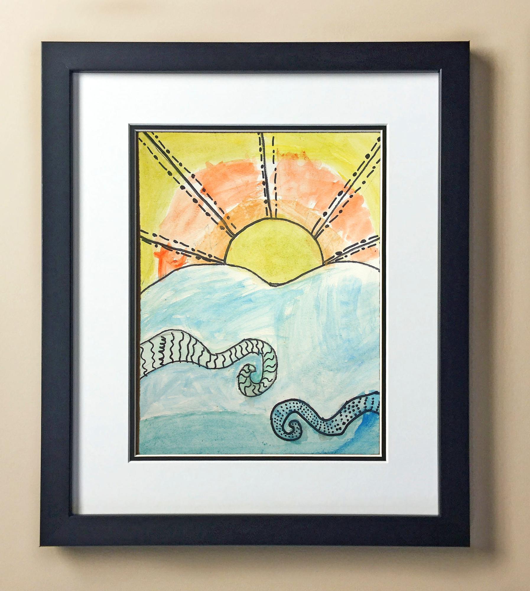 Included with the purchase is the Students Artwork, Frame, double matboard, shatter proof plexiglass, and a ready to hang backerboard with turnbuttons