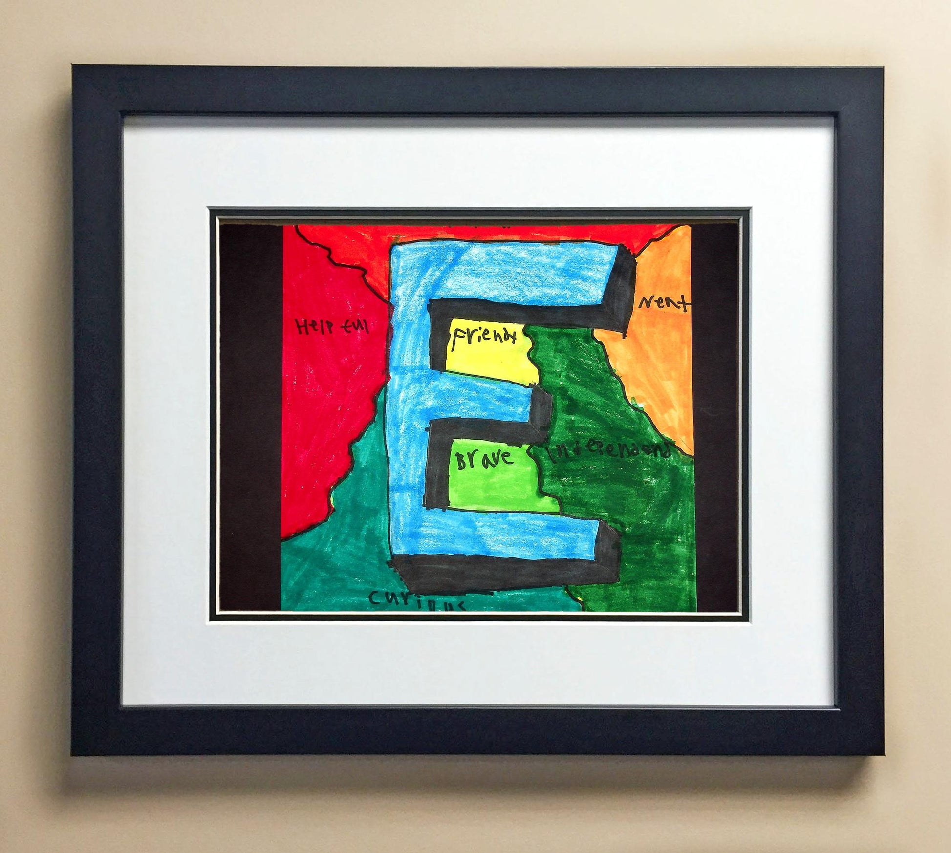 Included with the purchase is the Students Artwork, Frame, double matboard, shatter proof plexiglass, and a ready to hang backerboard with turnbuttons