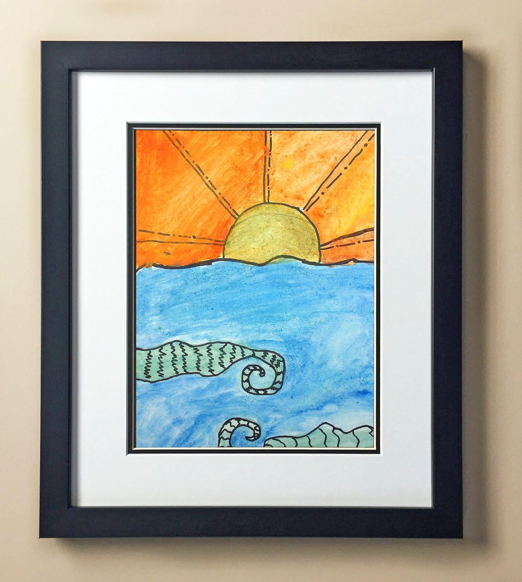 Included with the purchase is the Students Artwork, Frame, double matboard, shatter proof plexiglass, and a ready to hang backerboard with turnbuttons