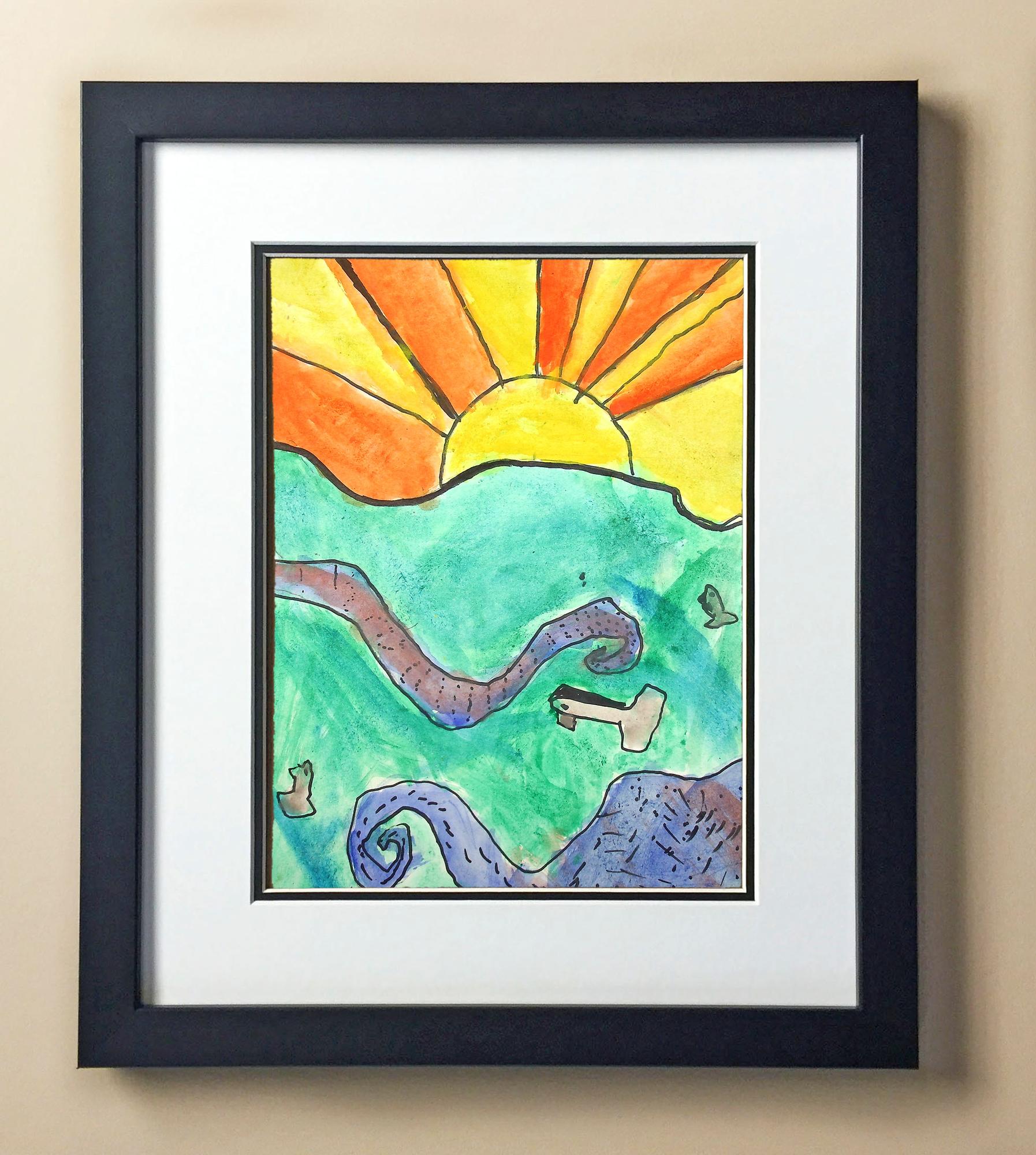 Included with the purchase is the Students Artwork, Frame, double matboard, shatter proof plexiglass, and a ready to hang backerboard with turnbuttons