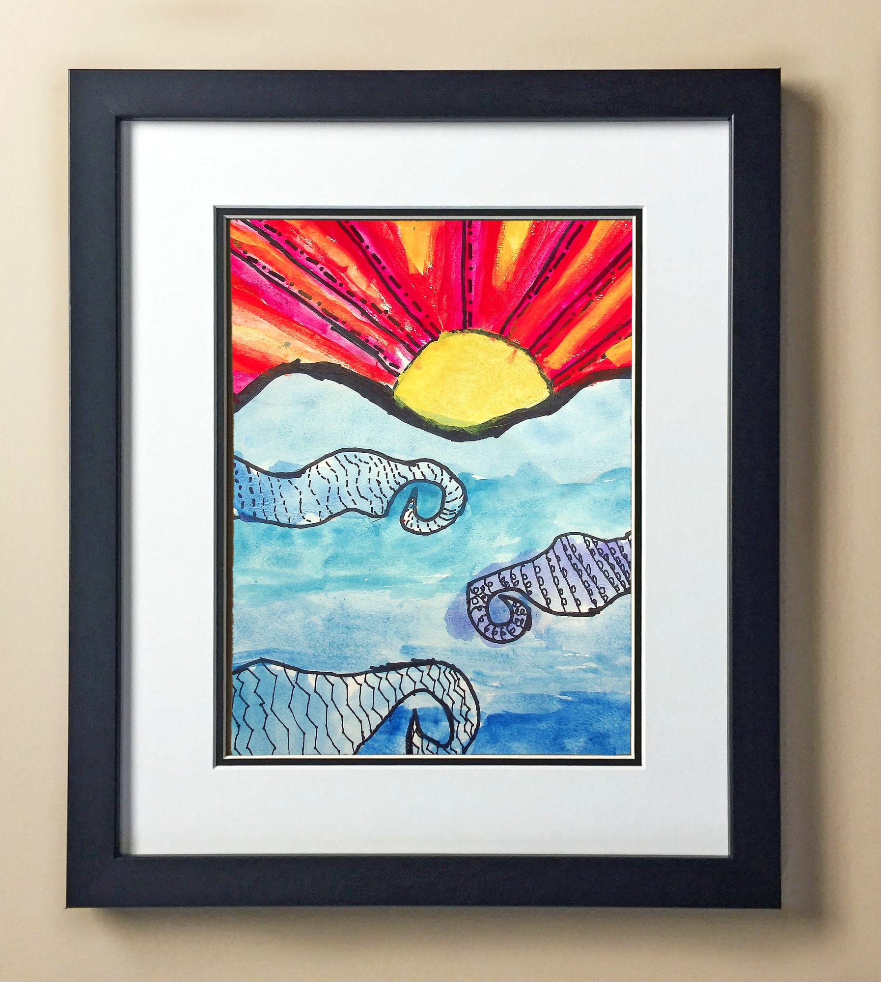 Included with the purchase is the Students Artwork, Frame, double matboard, shatter proof plexiglass, and a ready to hang backerboard with turnbuttons