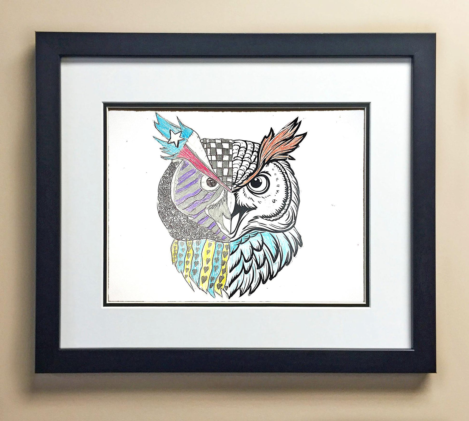 Included with the purchase is the Students Artwork, Frame, double matboard, shatter proof plexiglass, and a ready to hang backerboard with turnbuttons