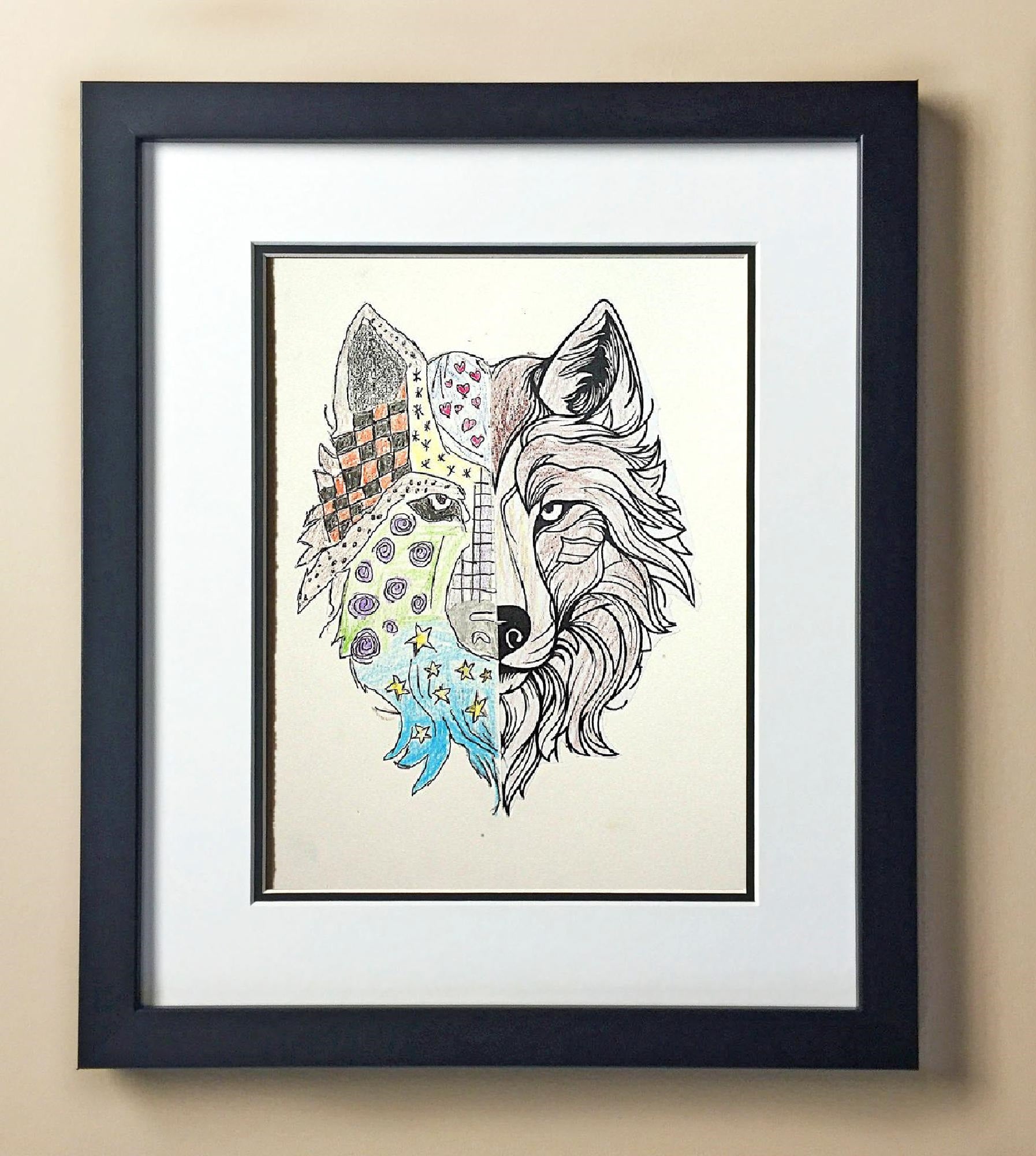 Included with the purchase is the Students Artwork, Frame, double matboard, shatter proof plexiglass, and a ready to hang backerboard with turnbuttons