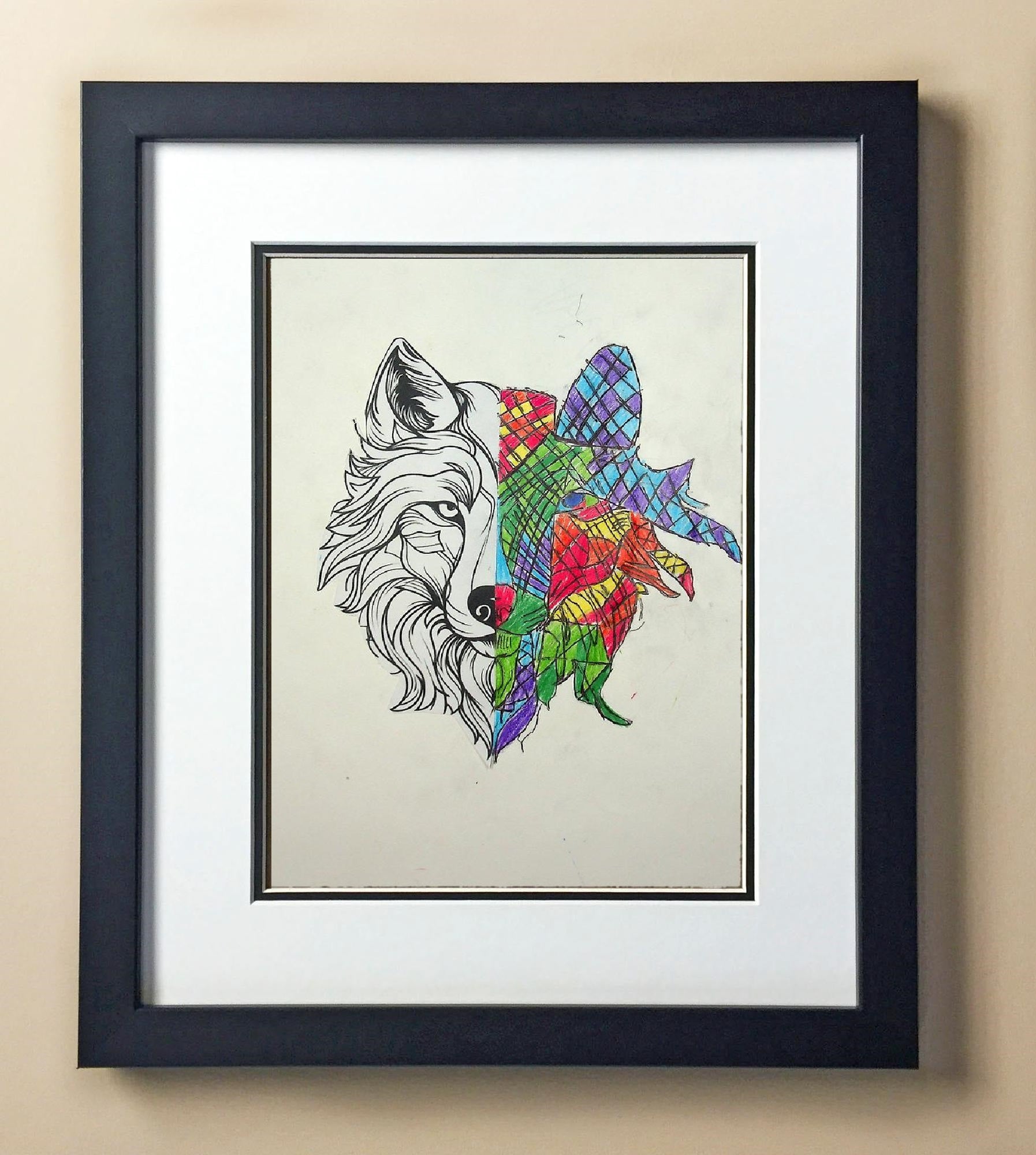 Included with the purchase is the Students Artwork, Frame, double matboard, shatter proof plexiglass, and a ready to hang backerboard with turnbuttons