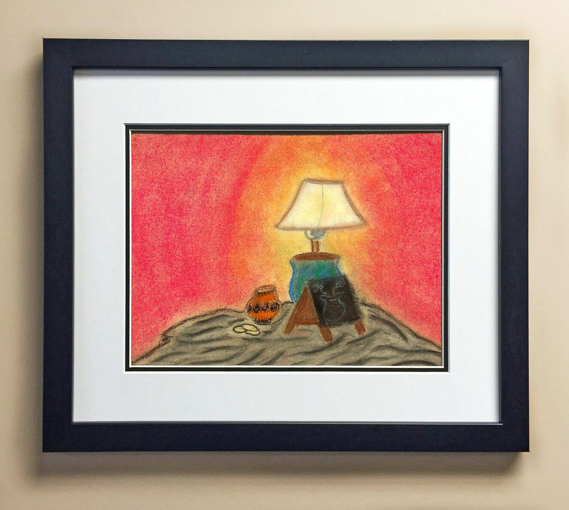 Included with the purchase is the Students Artwork, Frame, double matboard, shatter proof plexiglass, and a ready to hang backerboard with turnbuttons