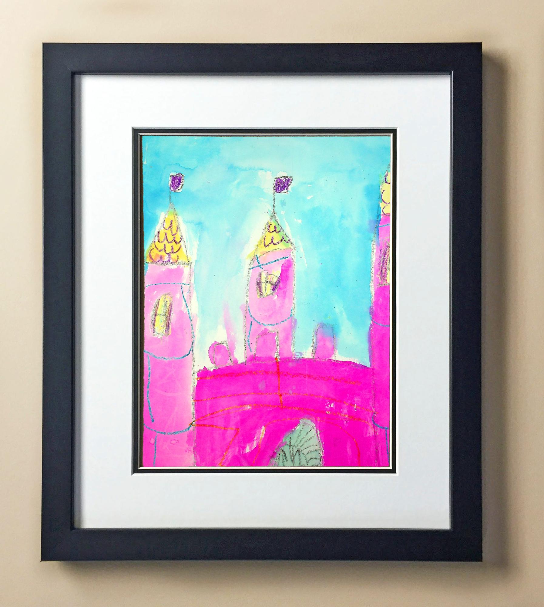 Included with the purchase is the Students Artwork, Frame, double matboard, shatter proof plexiglass, and a ready to hang backerboard with turnbuttons