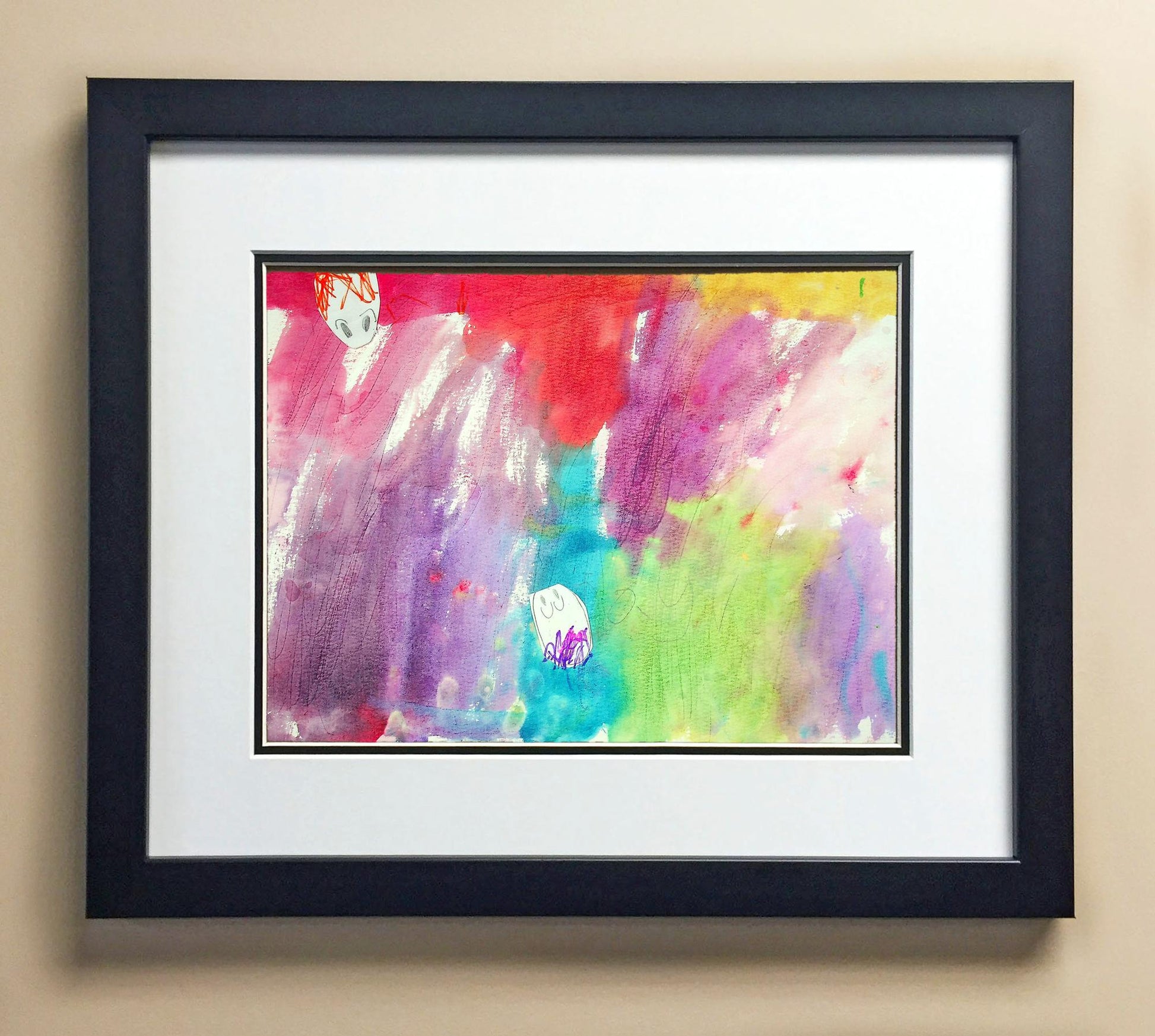 Included with the purchase is the Students Artwork, Frame, double matboard, shatter proof plexiglass, and a ready to hang backerboard with turnbuttons