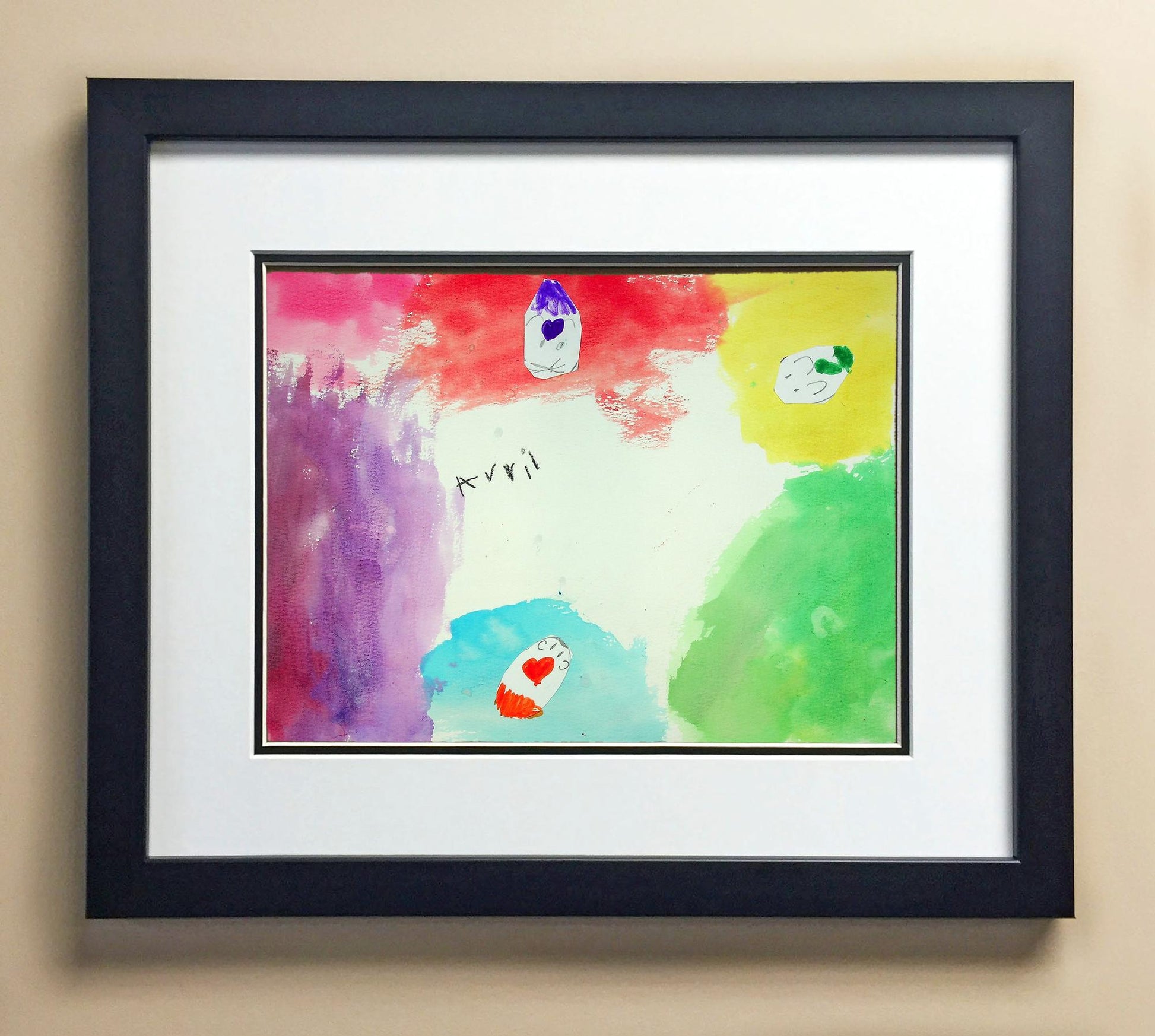 Included with the purchase is the Students Artwork, Frame, double matboard, shatter proof plexiglass, and a ready to hang backerboard with turnbuttons