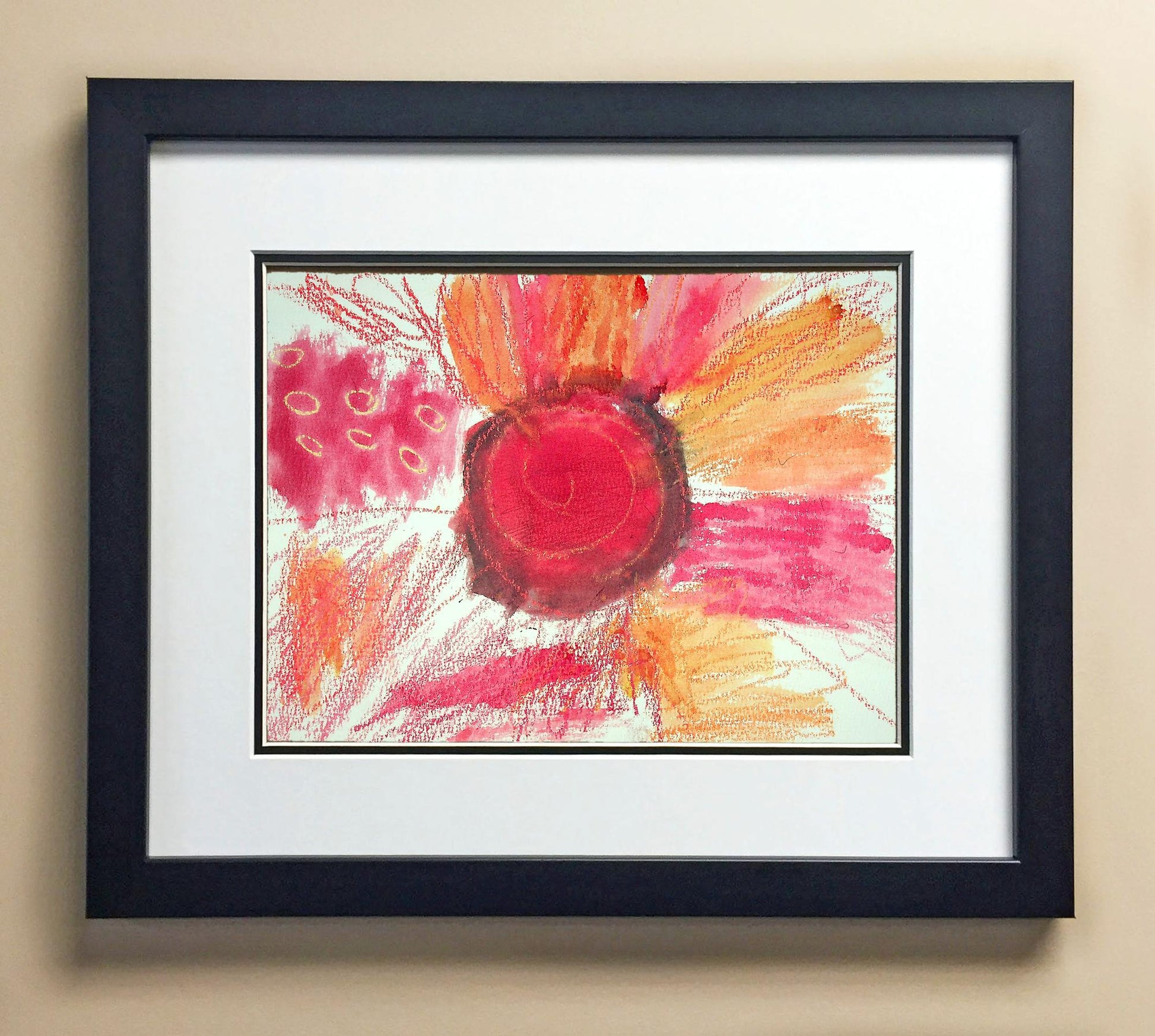 Included with the purchase is the Students Artwork, Frame, double matboard, shatter proof plexiglass, and a ready to hang backerboard with turnbuttons