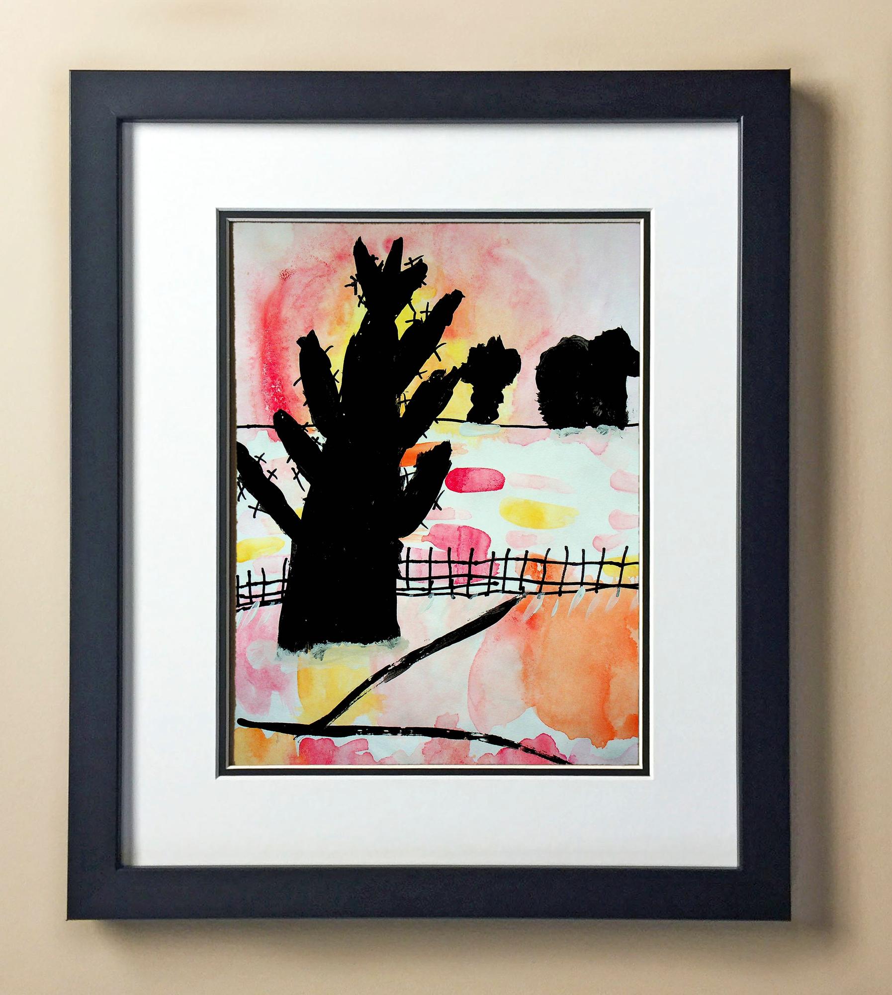 Included with the purchase is the Students Artwork, Frame, double matboard, shatter proof plexiglass, and a ready to hang backerboard with turnbuttons