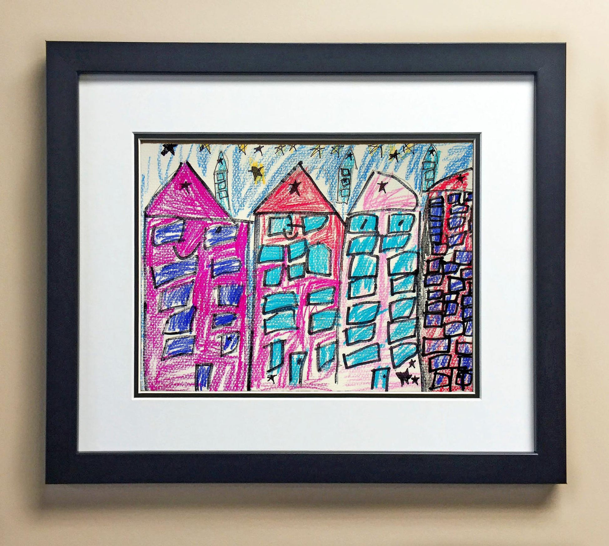 Included with the purchase is the Students Artwork, Frame, double matboard, shatter proof plexiglass, and a ready to hang backerboard with turnbuttons