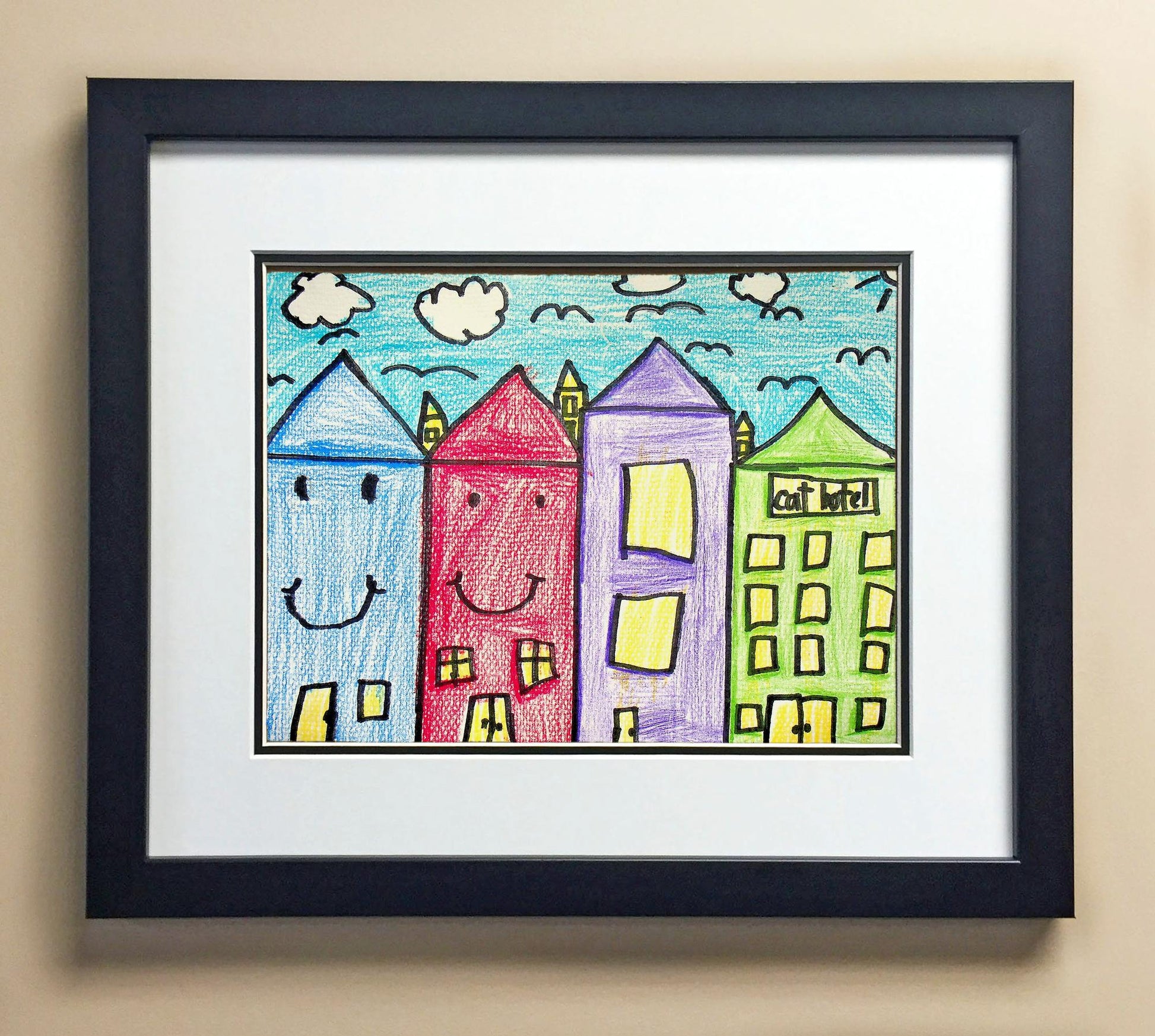 Included with the purchase is the Students Artwork, Frame, double matboard, shatter proof plexiglass, and a ready to hang backerboard with turnbuttons