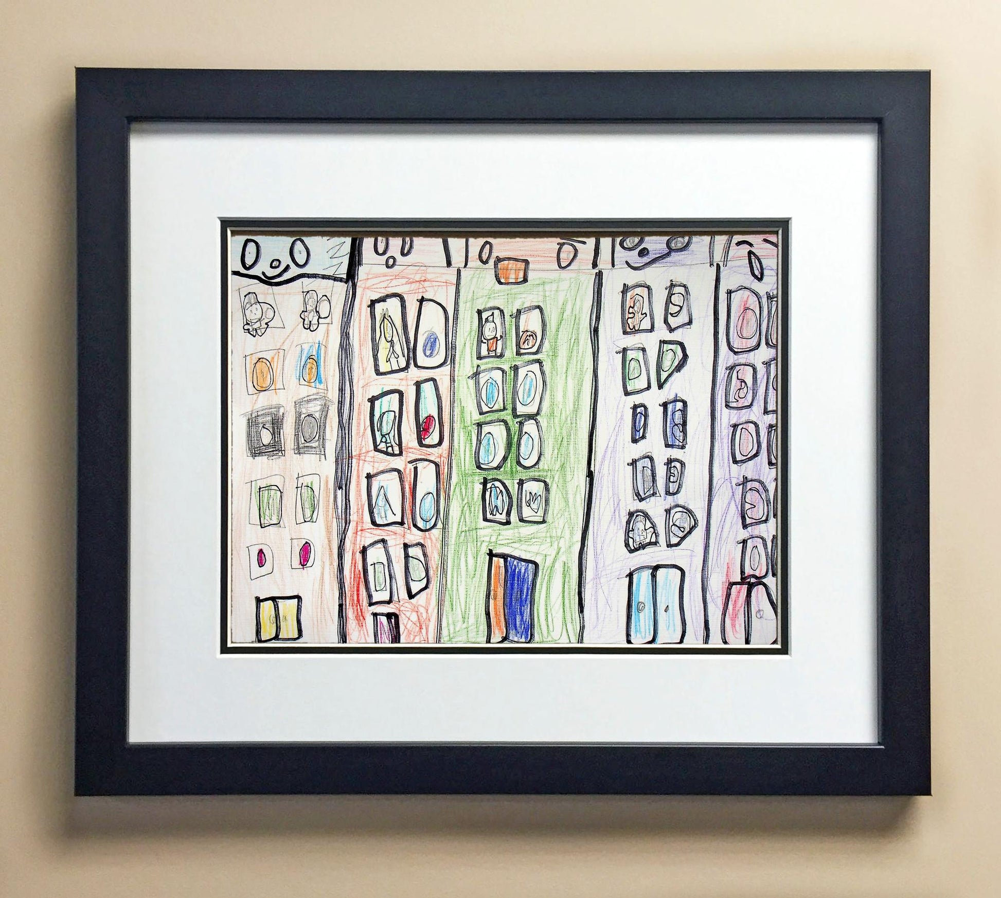 Included with the purchase is the Students Artwork, Frame, double matboard, shatter proof plexiglass, and a ready to hang backerboard with turnbuttons