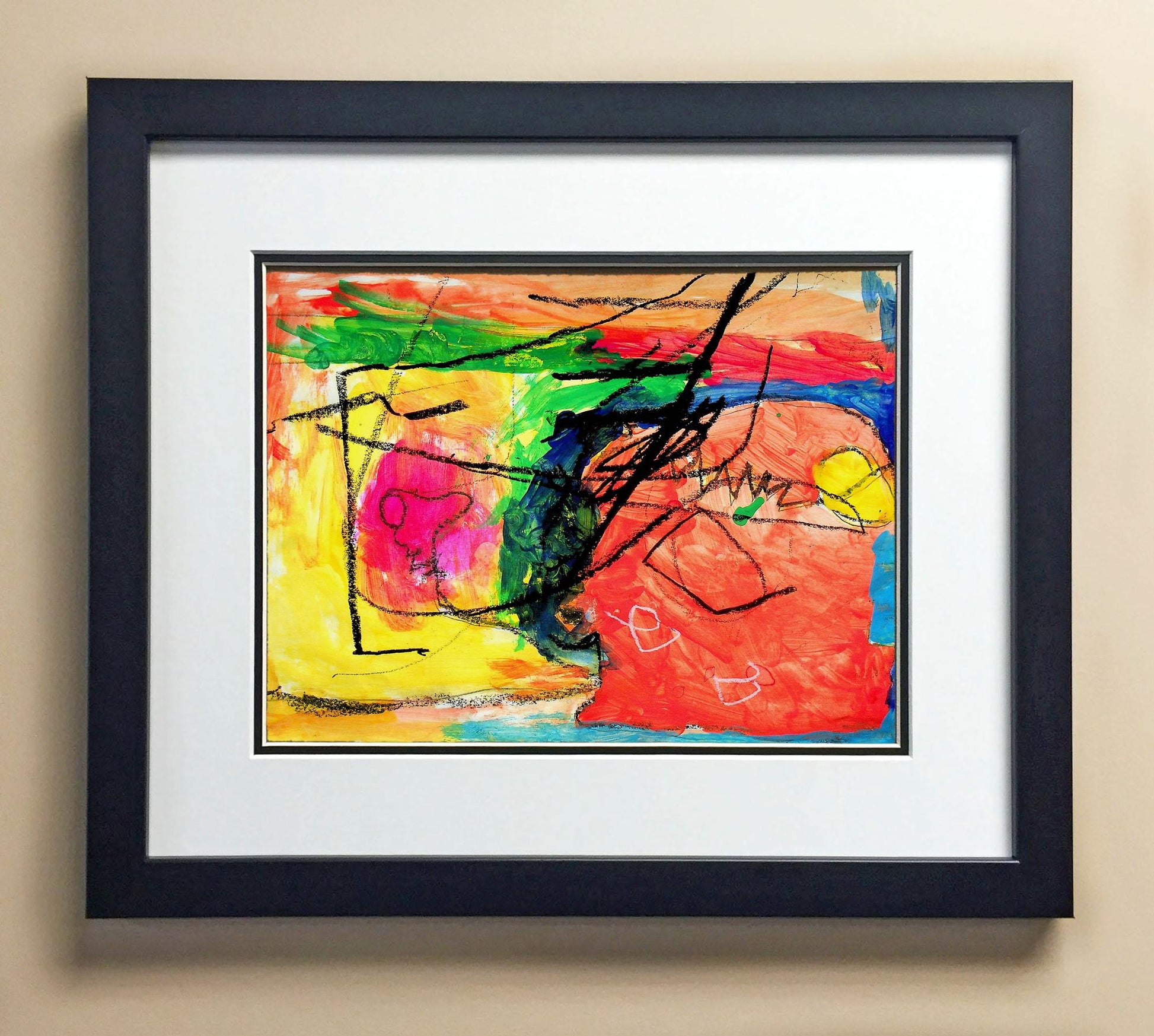 Included with the purchase is the Students Artwork, Frame, double matboard, shatter proof plexiglass, and a ready to hang backerboard with turnbuttons