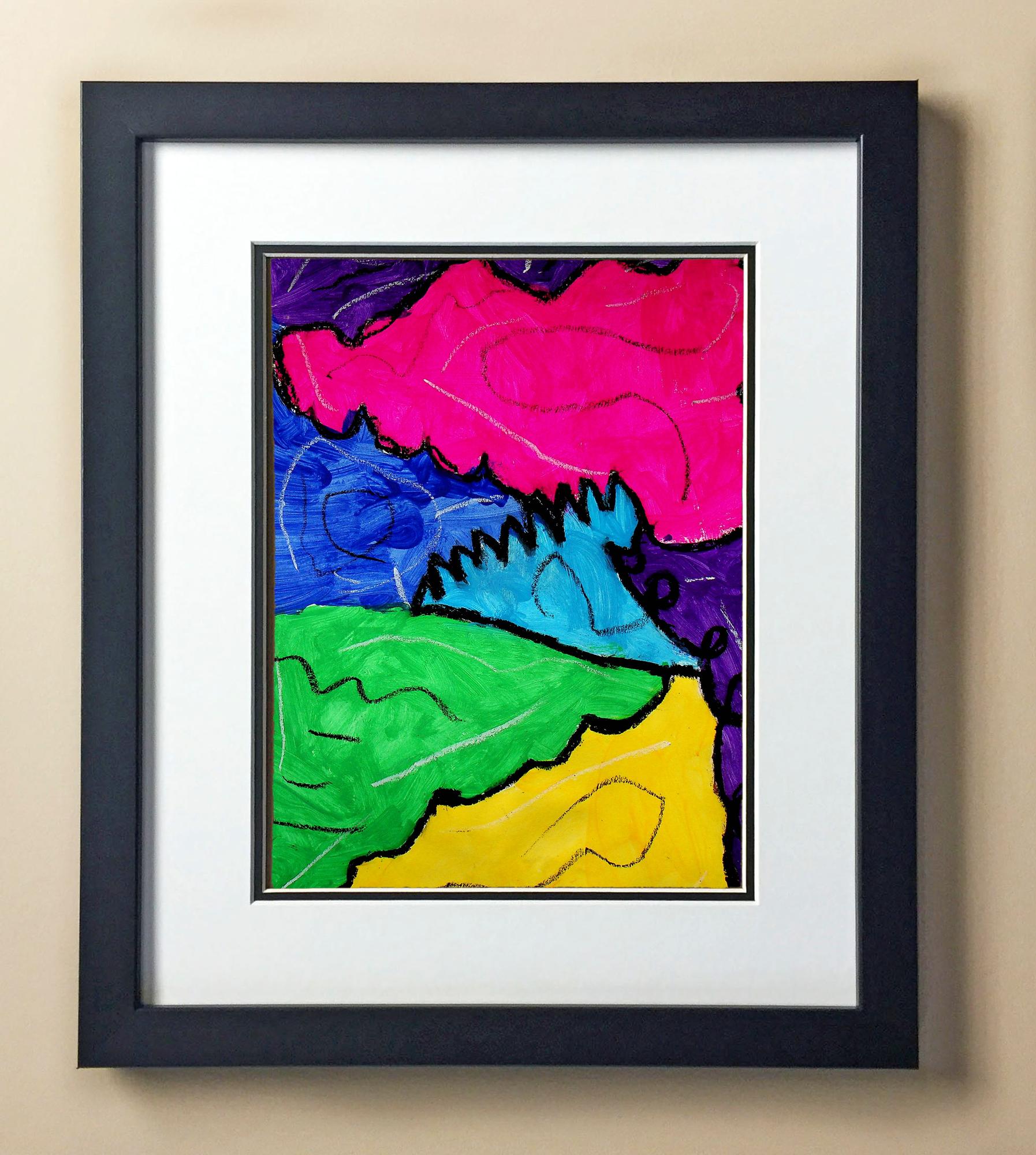 Included with the purchase is the Students Artwork, Frame, double matboard, shatter proof plexiglass, and a ready to hang backerboard with turnbuttons