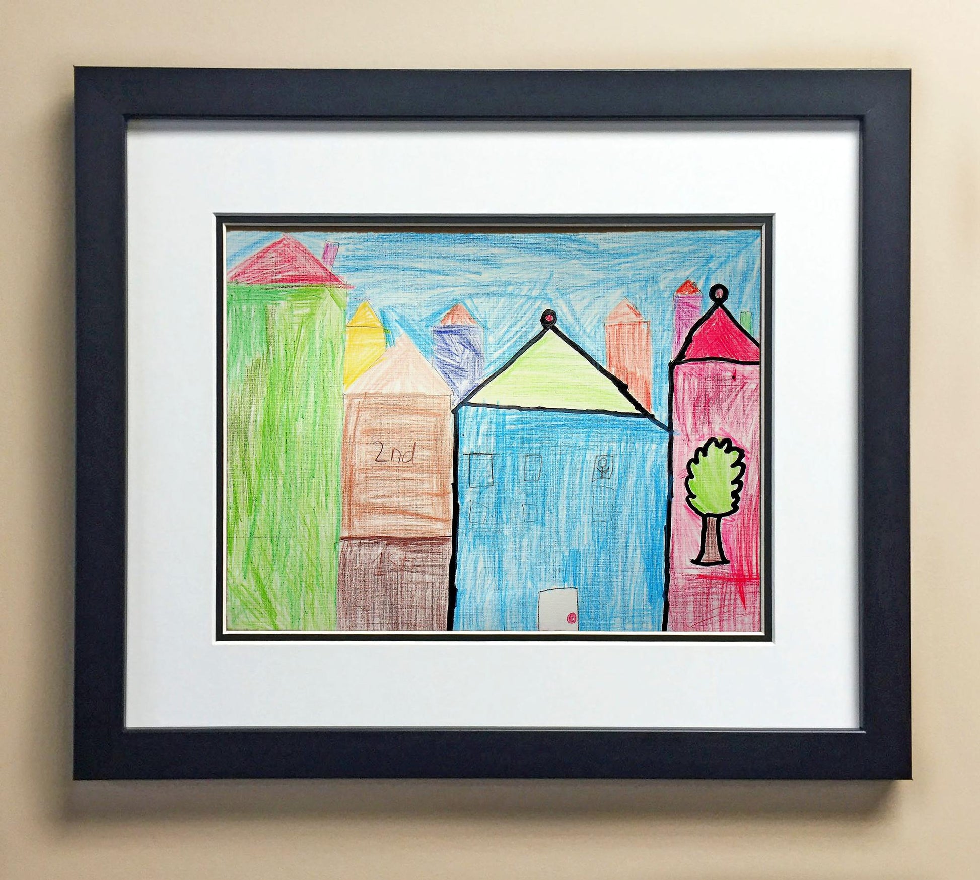 Included with the purchase is the Students Artwork, Frame, double matboard, shatter proof plexiglass, and a ready to hang backerboard with turnbuttons