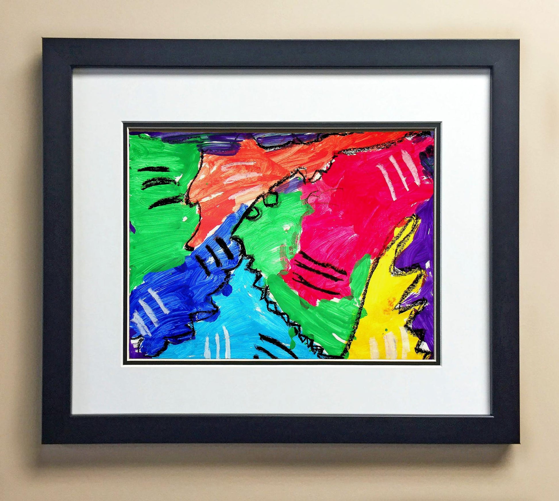 Included with the purchase is the Students Artwork, Frame, double matboard, shatter proof plexiglass, and a ready to hang backerboard with turnbuttons