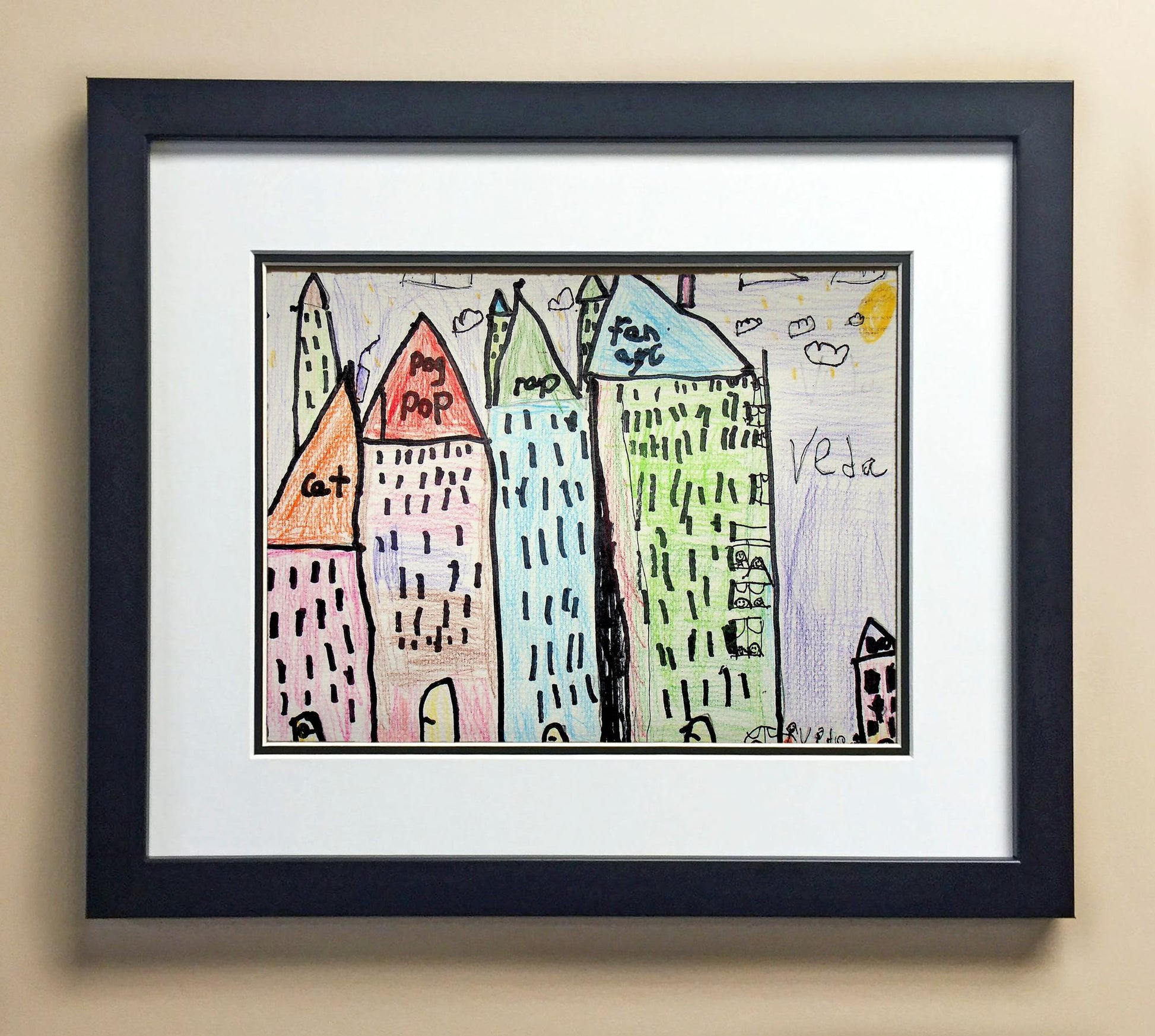 Included with the purchase is the Students Artwork, Frame, double matboard, shatter proof plexiglass, and a ready to hang backerboard with turnbuttons