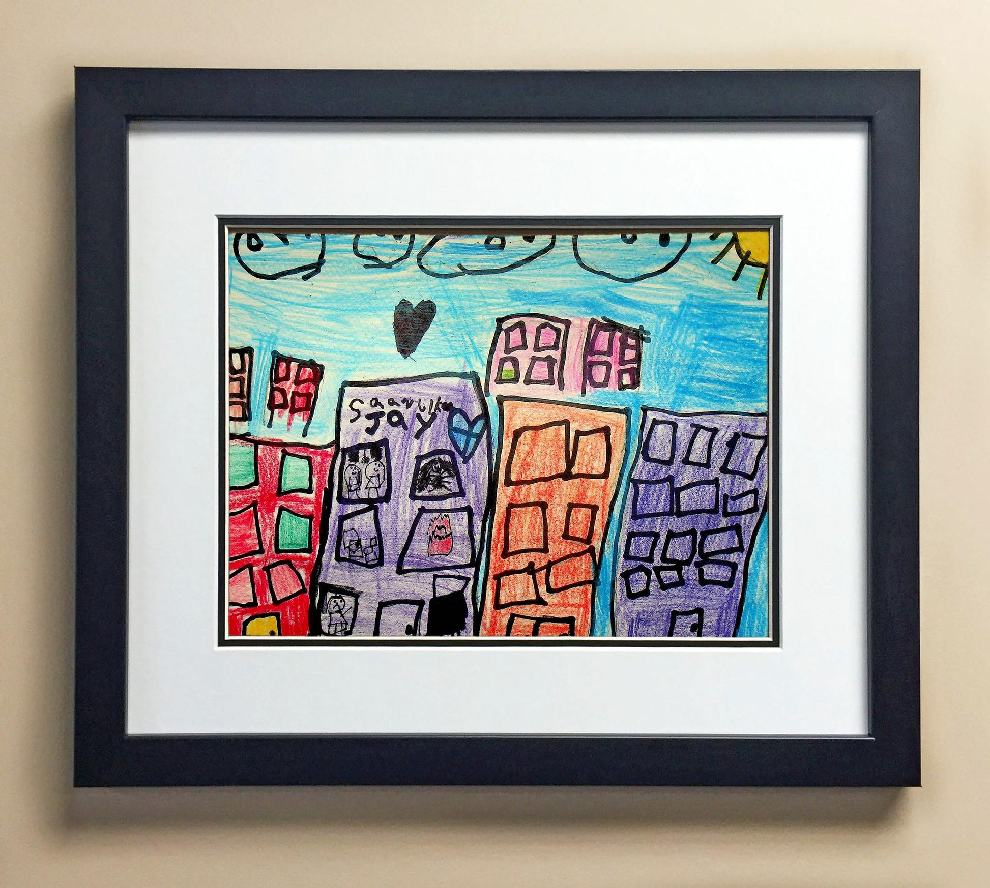 Included with the purchase is the Students Artwork, Frame, double matboard, shatter proof plexiglass, and a ready to hang backerboard with turnbuttons