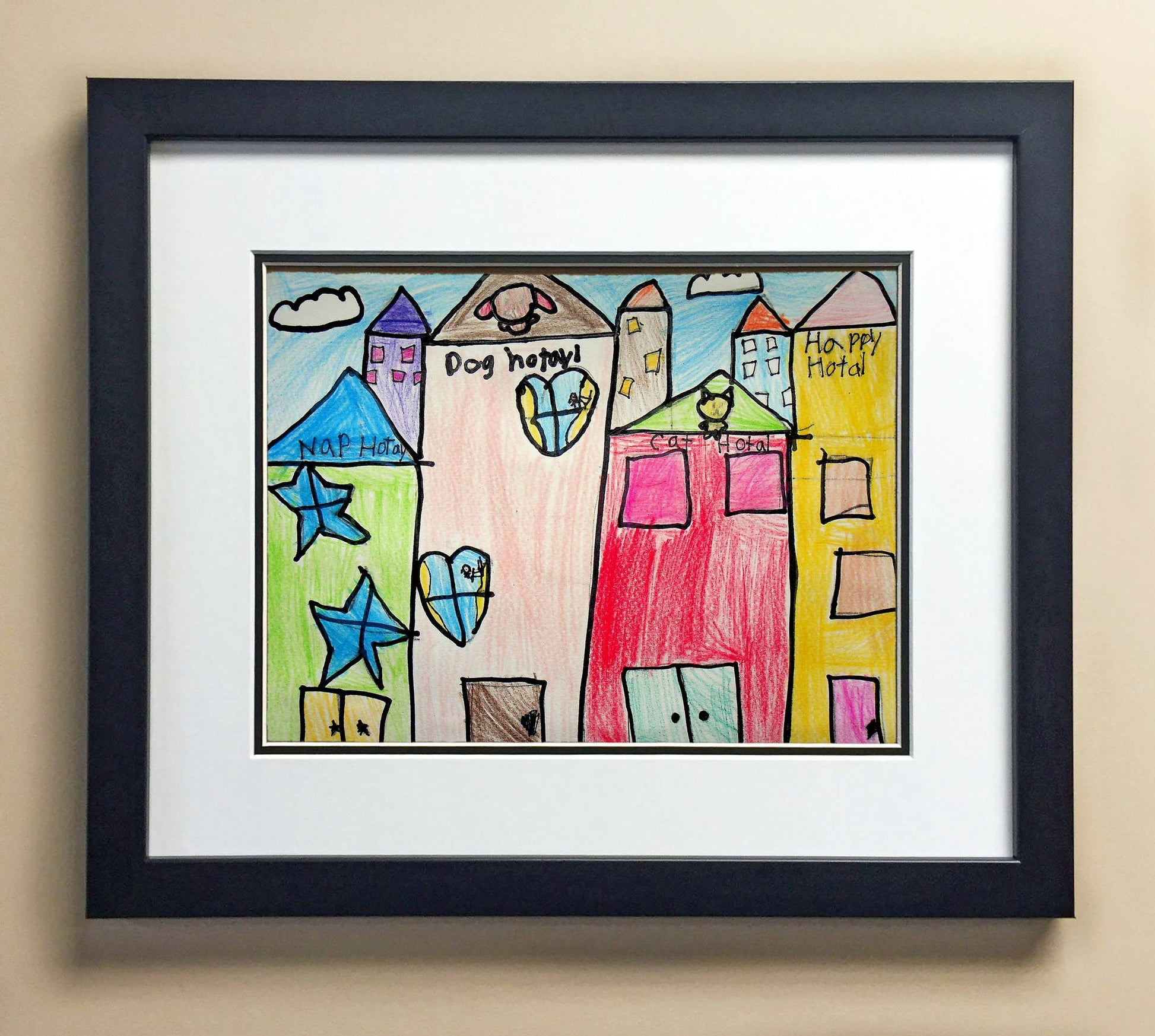 Included with the purchase is the Students Artwork, Frame, double matboard, shatter proof plexiglass, and a ready to hang backerboard with turnbuttons