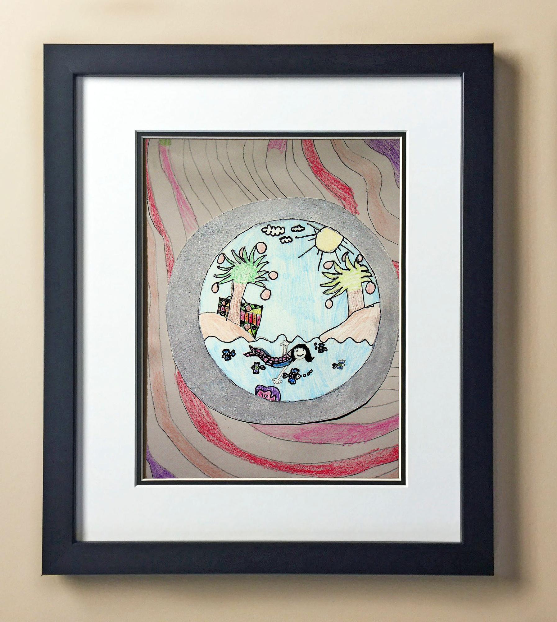 Included with the purchase is the Students Artwork, Frame, double matboard, shatter proof plexiglass, and a ready to hang backerboard with turnbuttons