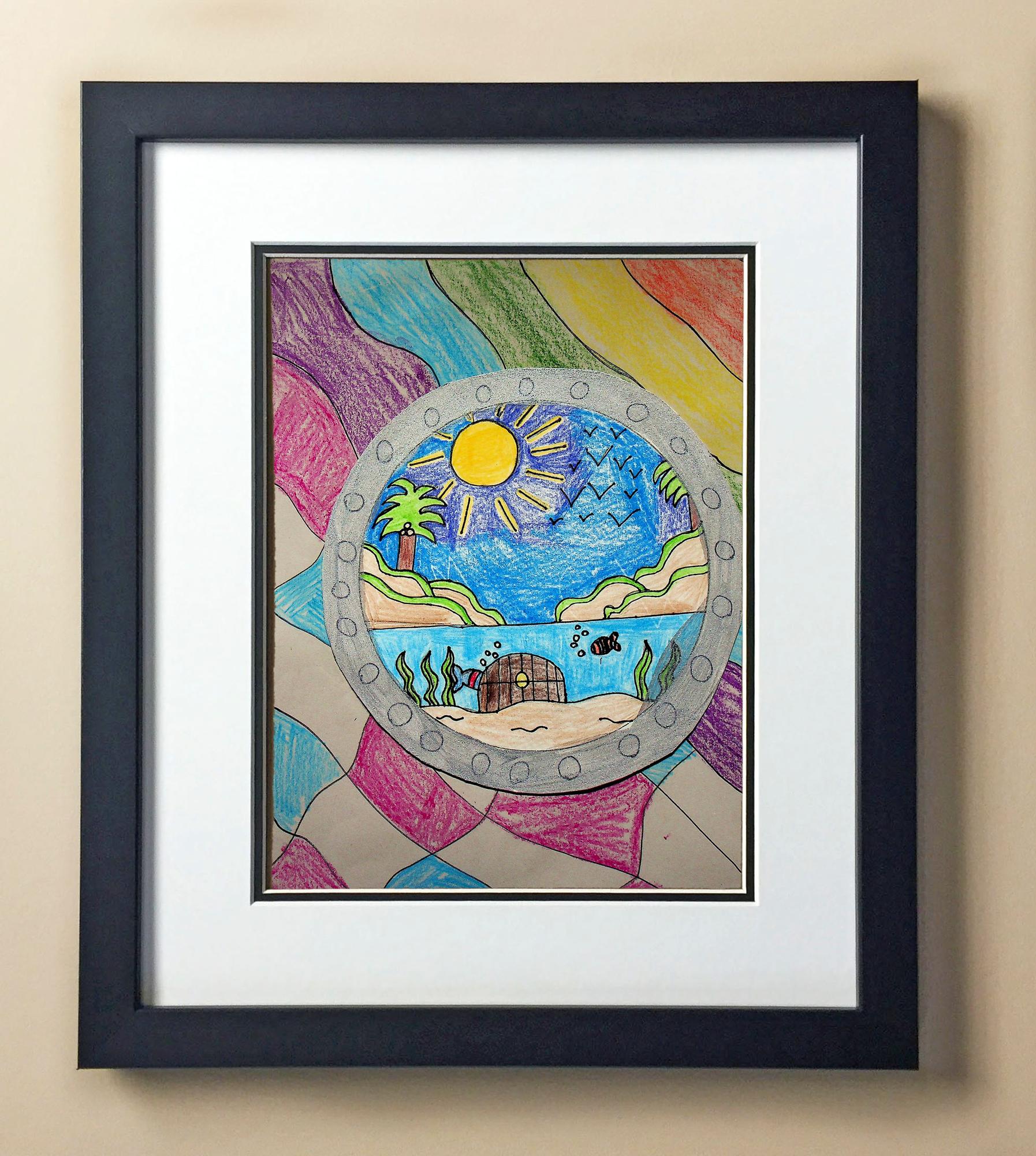 Included with the purchase is the Students Artwork, Frame, double matboard, shatter proof plexiglass, and a ready to hang backerboard with turnbuttons