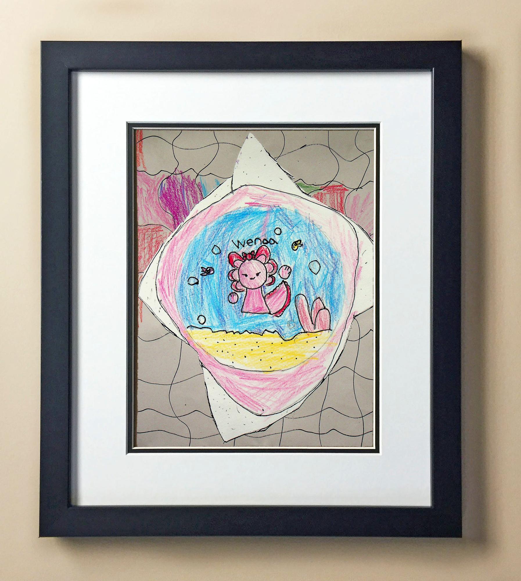 Included with the purchase is the Students Artwork, Frame, double matboard, shatter proof plexiglass, and a ready to hang backerboard with turnbuttons