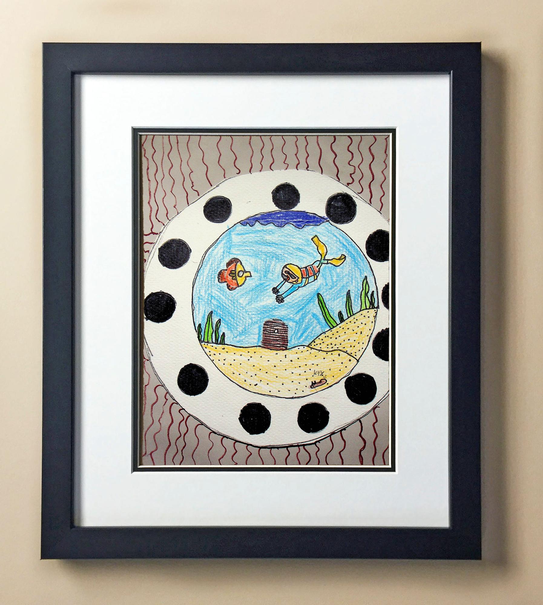 Included with the purchase is the Students Artwork, Frame, double matboard, shatter proof plexiglass, and a ready to hang backerboard with turnbuttons