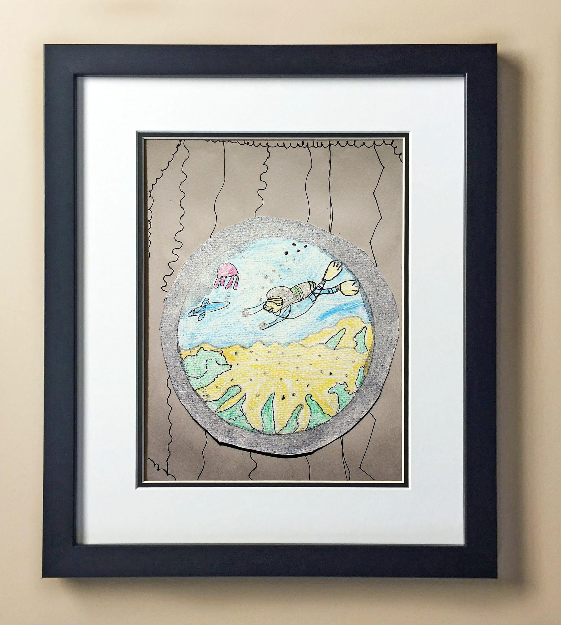 Included with the purchase is the Students Artwork, Frame, double matboard, shatter proof plexiglass, and a ready to hang backerboard with turnbuttons