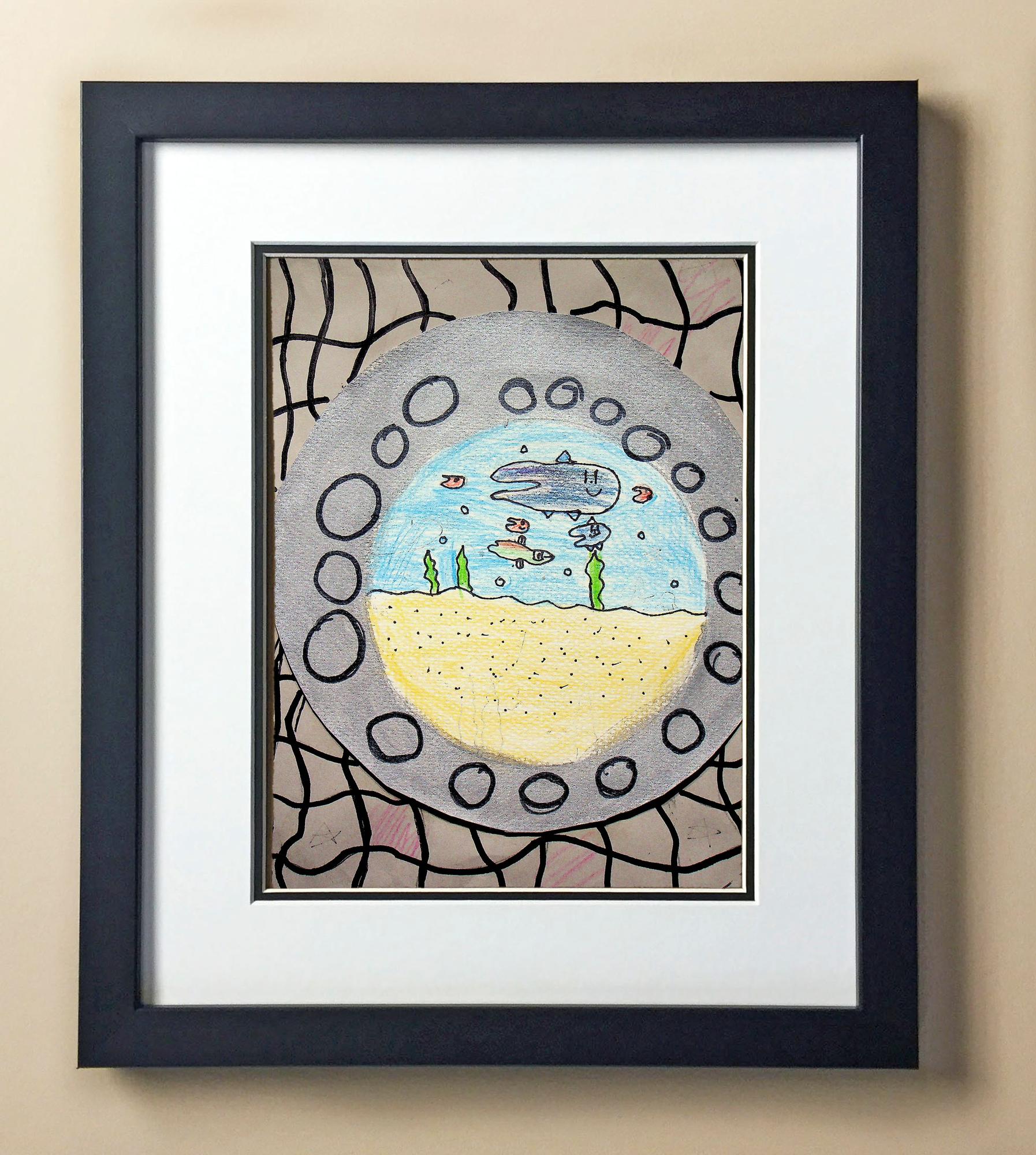 Included with the purchase is the Students Artwork, Frame, double matboard, shatter proof plexiglass, and a ready to hang backerboard with turnbuttons