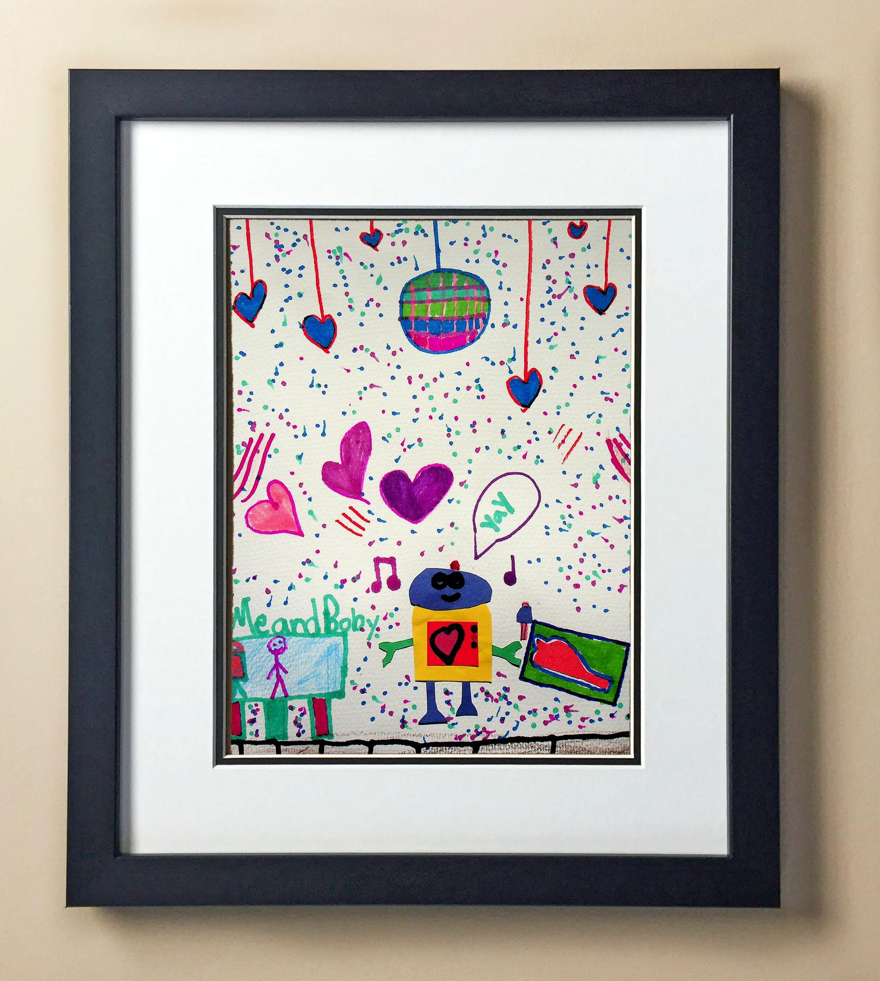 Included with the purchase is the Students Artwork, Frame, double matboard, shatter proof plexiglass, and a ready to hang backerboard with turnbuttons