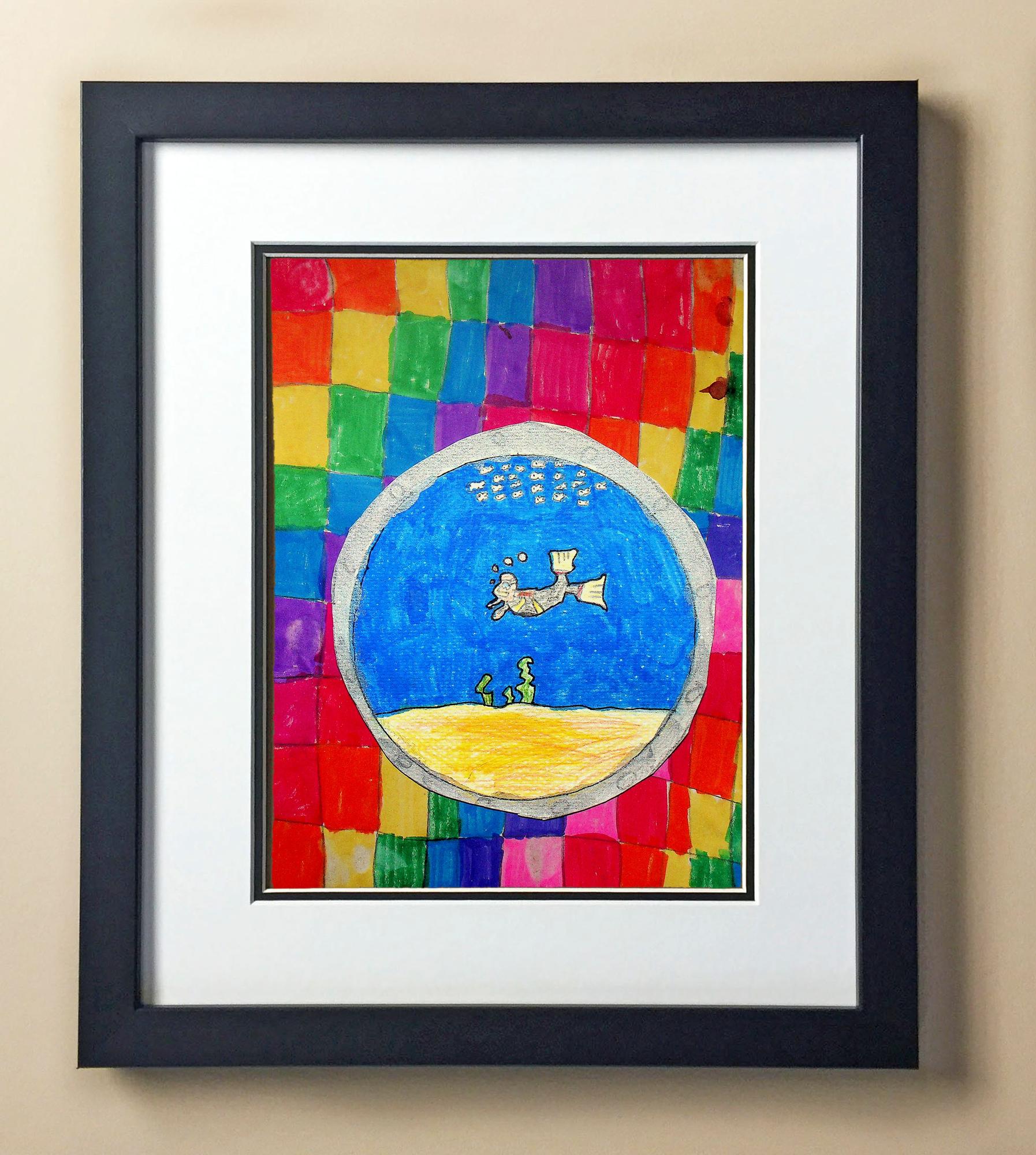 Included with the purchase is the Students Artwork, Frame, double matboard, shatter proof plexiglass, and a ready to hang backerboard with turnbuttons