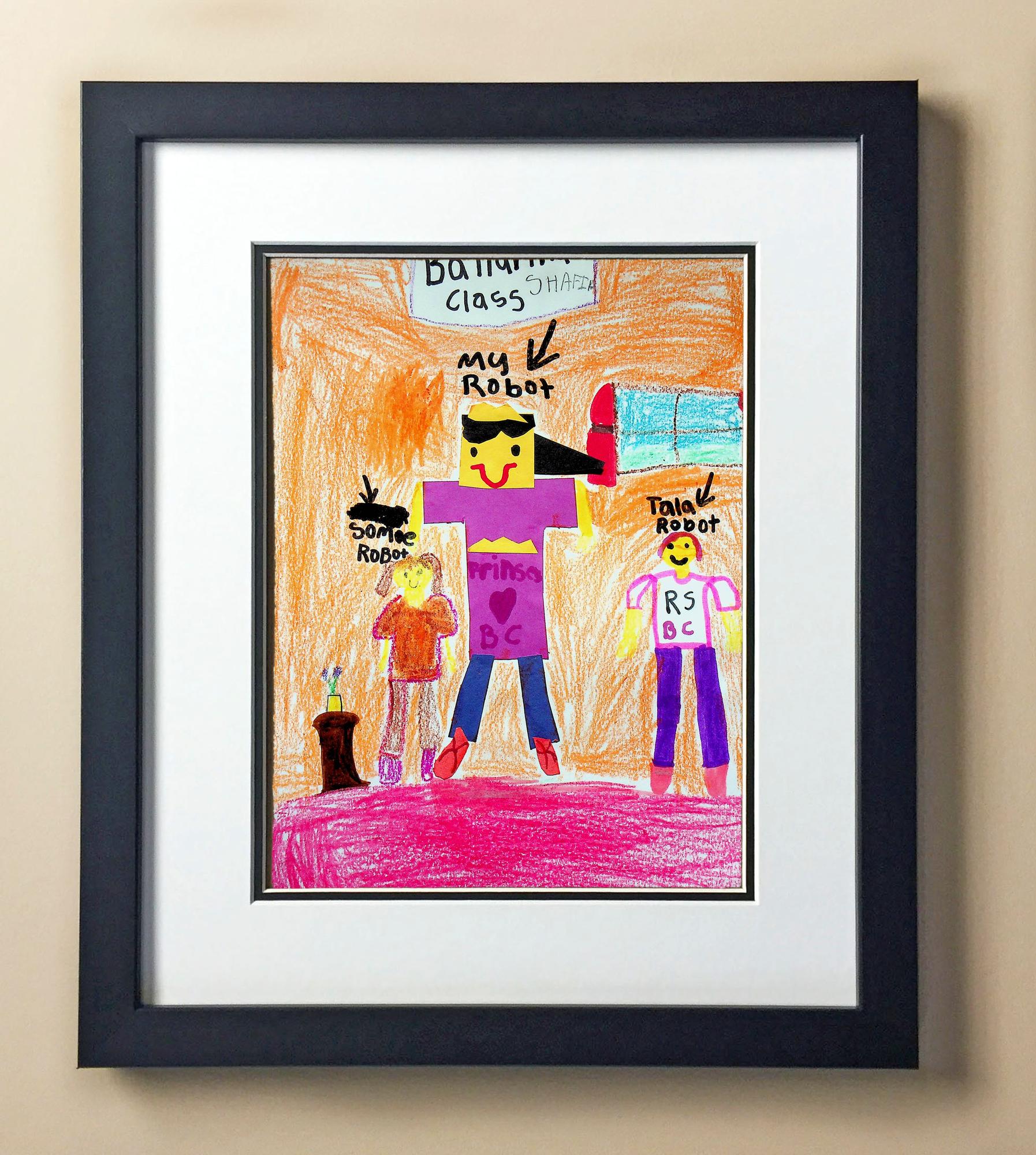 Included with the purchase is the Students Artwork, Frame, double matboard, shatter proof plexiglass, and a ready to hang backerboard with turnbuttons