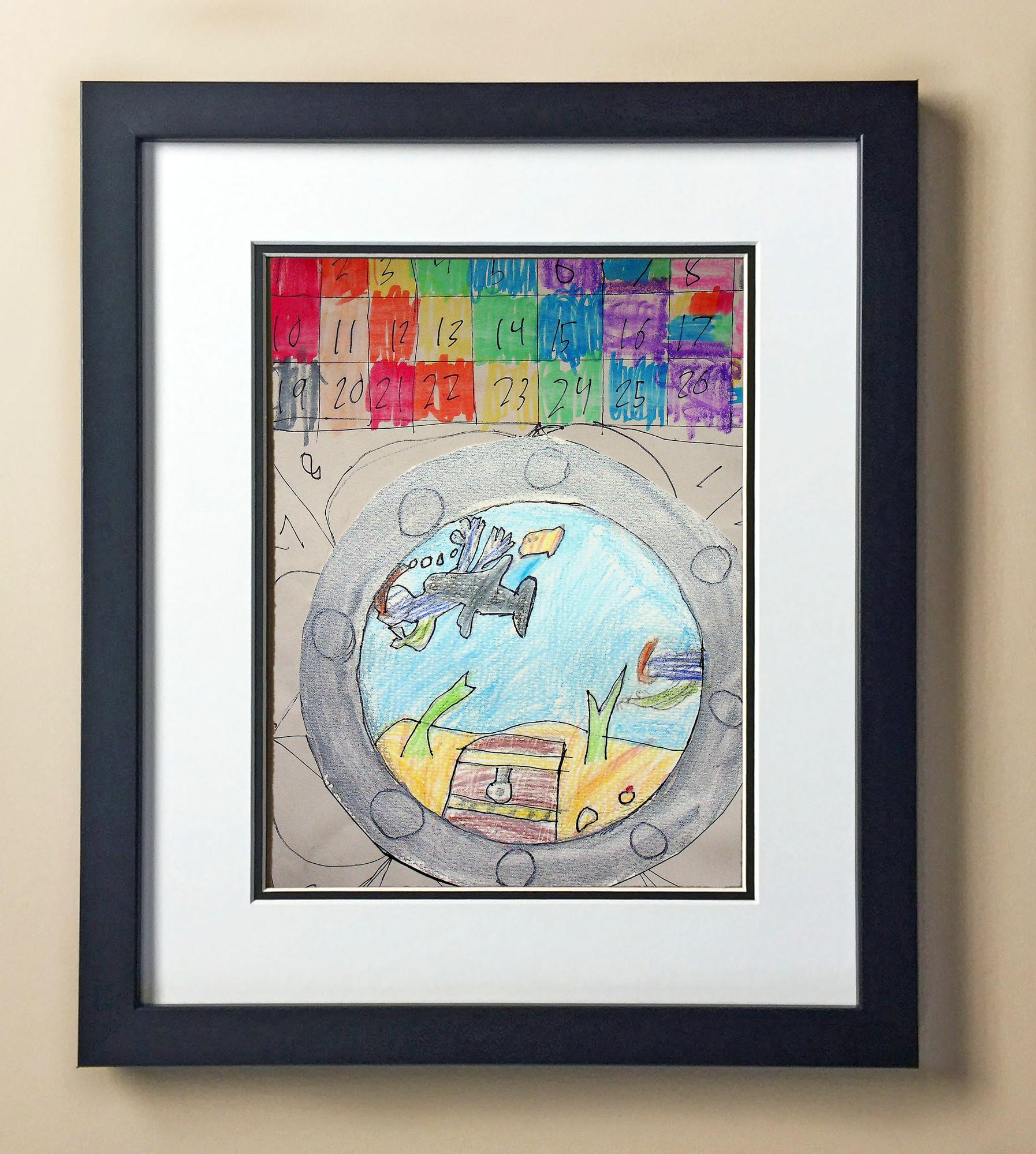 Included with the purchase is the Students Artwork, Frame, double matboard, shatter proof plexiglass, and a ready to hang backerboard with turnbuttons